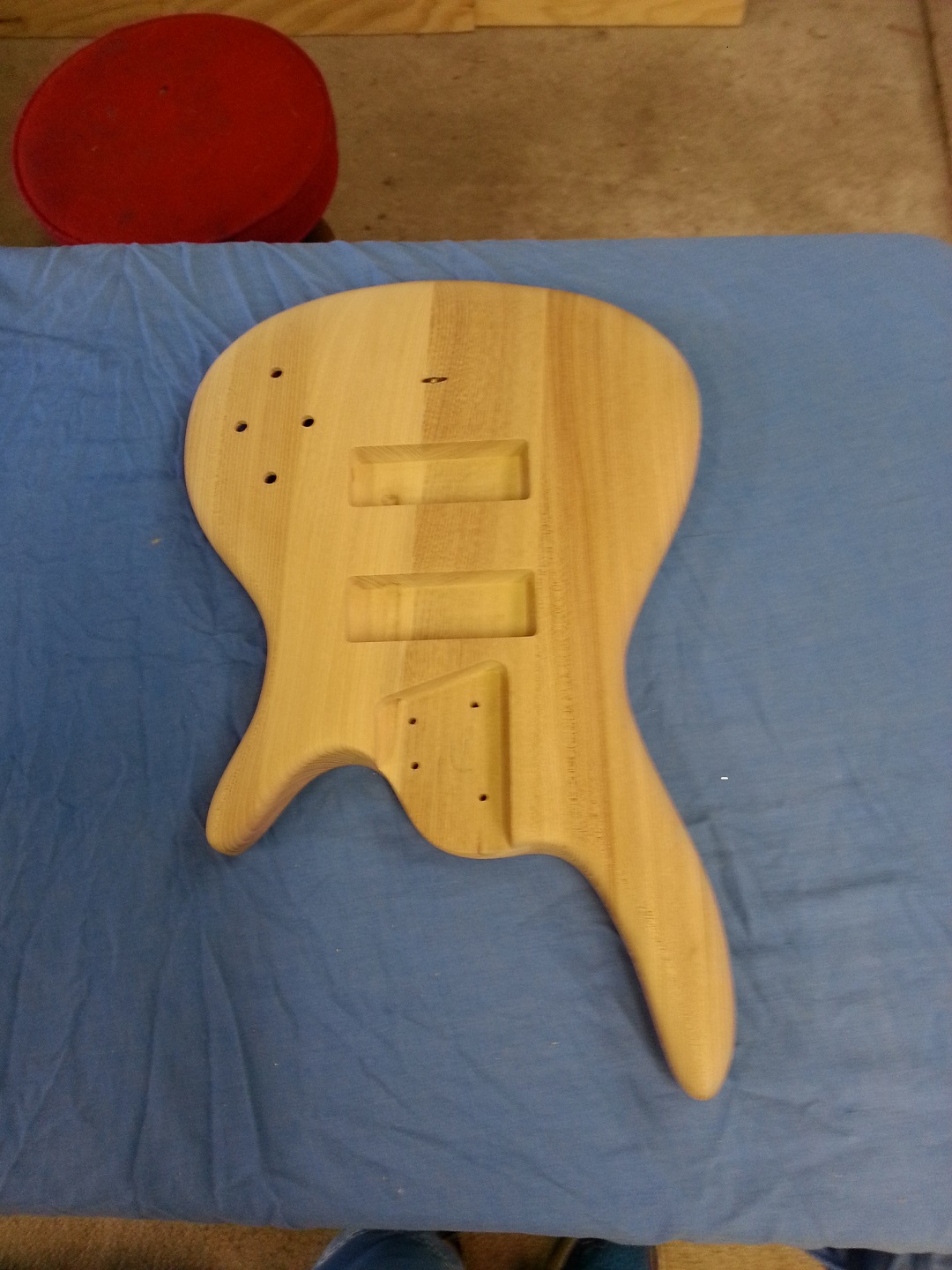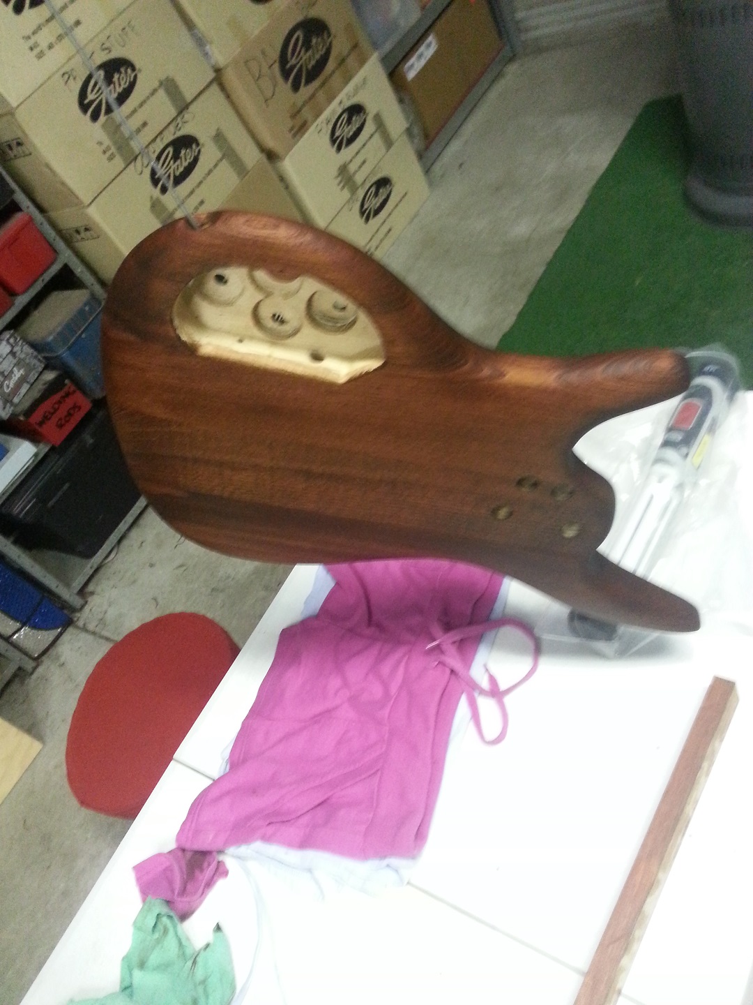 I have sanded the neck and the body, as well as recessing the jack hole as well as squaring it off on the other side so the nut can sit flush. I have stained the head stock and the body and have put around 7 coats of tru-oil on the body and about 5 on the head stock