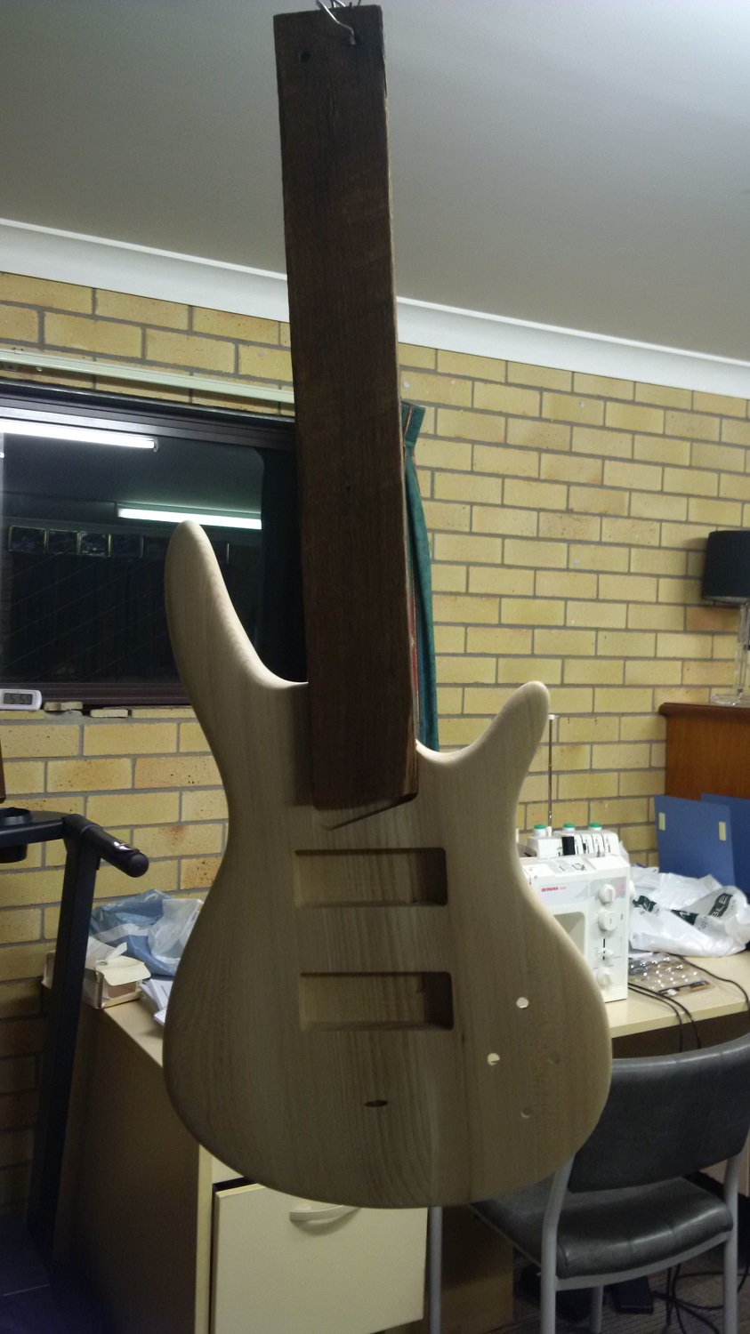 I've attached a bit of hardwood to make it easier when i'm trying to stain it. The hardwood is just screwed on through the holes in the body which the neck will bolt on thru.