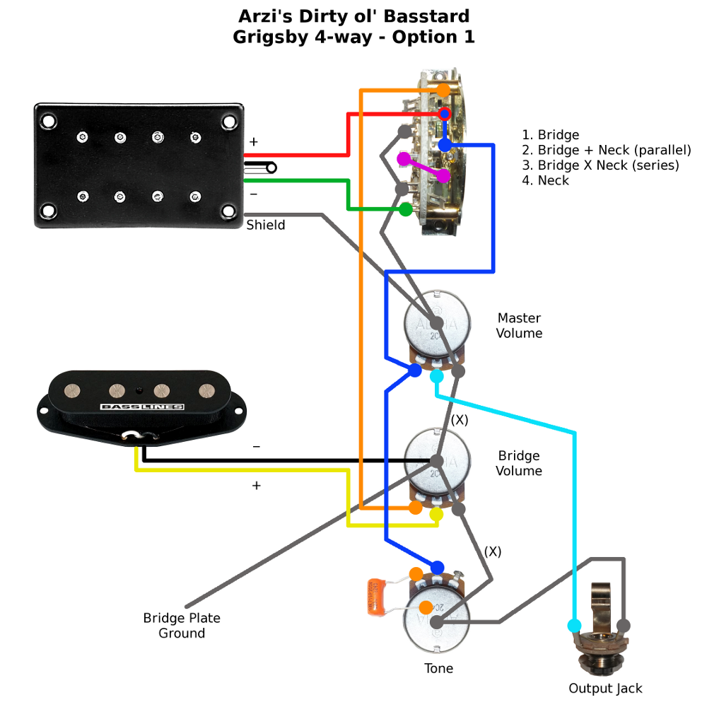 The "Hemi" or now "Dirty ol' basstard"... Is in a stage where I have to begin planning the wiring job. I'm going for three pots - just one tone and two volumes with no push-pull option. Would you mind helping me with a diagram to connect these?