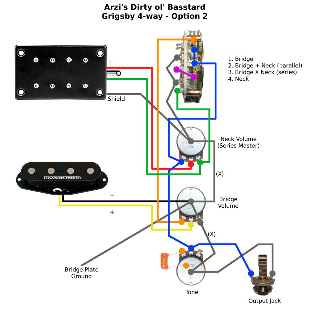 This version has the same Bridge volume but uses a bit of switch trickery to give you a hybrid Neck volume. Essentially, the ground connection on the Neck volume pot is only connected in positions 2 & 4. This means that in position 1 you get a Bridge Volume and the Neck Volume has no effect. In position 2, with both pickups in parallel, you have both a Bridge Volume and Neck Volume, allowing individual control of each pickup. Position 4, neck pickup only, you have a Neck Volume and the Bridge Volume has no effect.