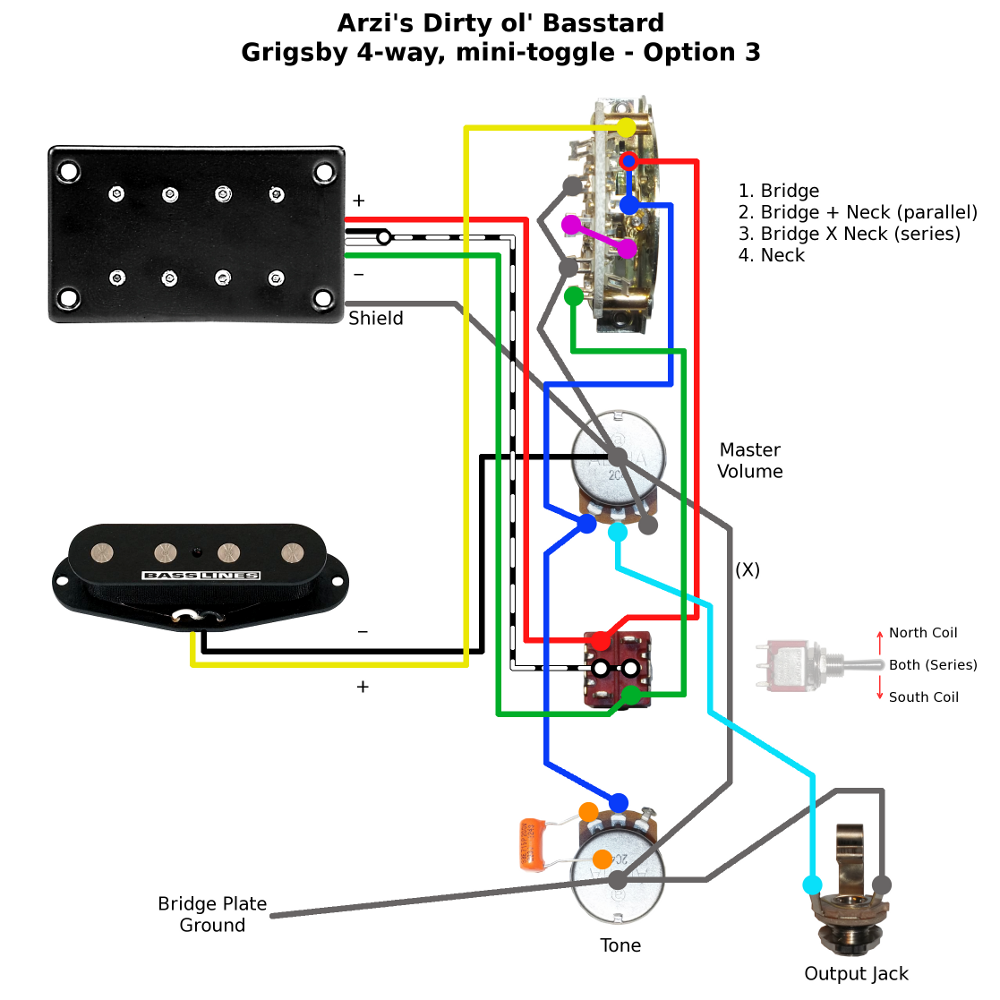 Tele 4-way layout with On/On/On mini-toggle giving North/Both/South coil options on the DP120 neck pickup: