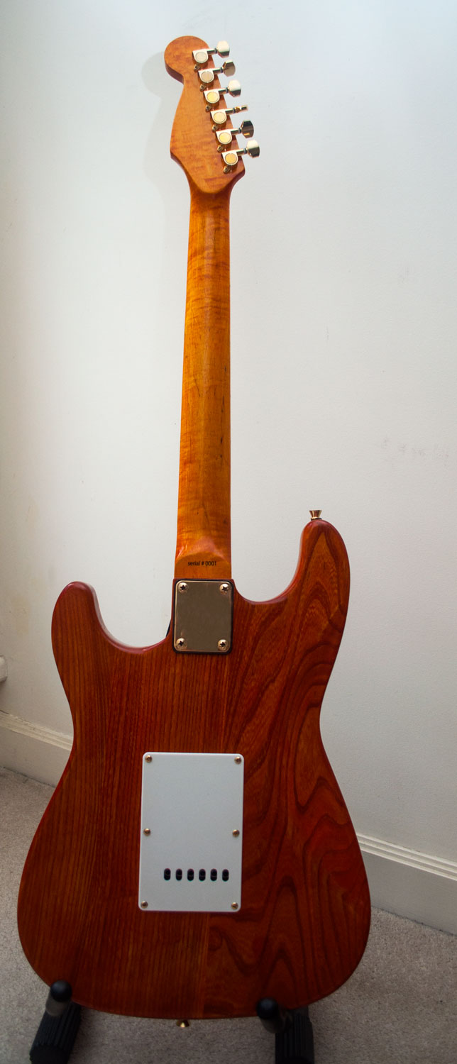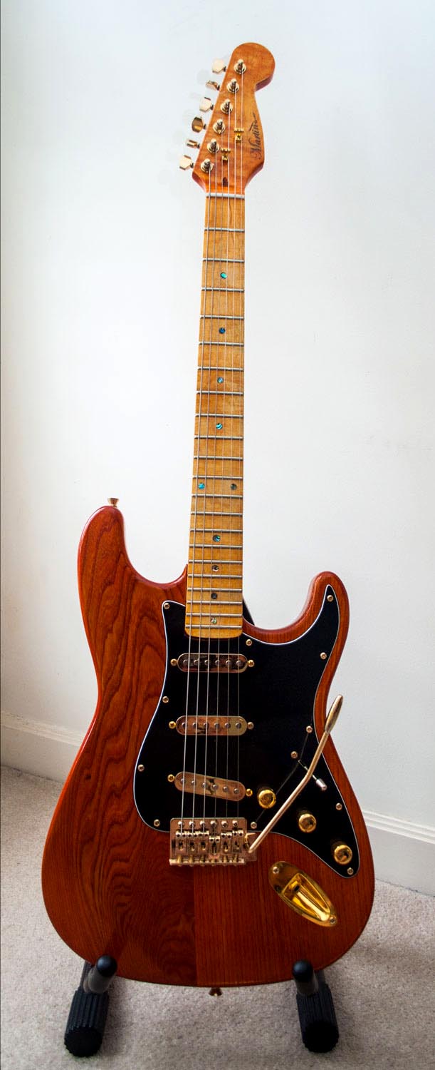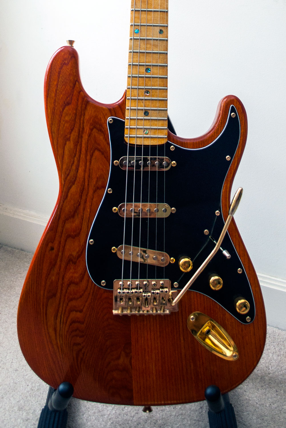 Gold hardware works really well with colours used on this Strat and love the Paua fret markers on the maple fret board.