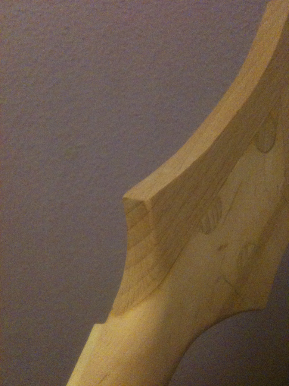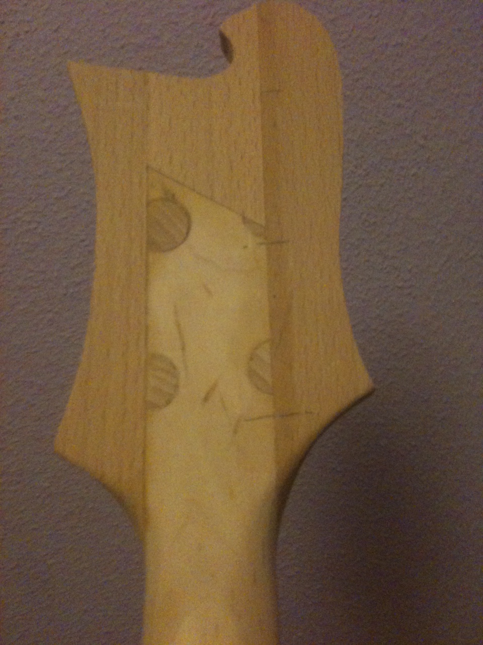 Hi guys, new years update...last night i worked a lot (from 11pm to 2a.m.) giving some touches to the headstock after i returned from my inlaws residence (up to 500 km) i couldn't resist myself reshaping the new headstock, cut it and sand down with 100 grain. All by hand, only dremel was used a little bit with the inside of the up horn. Beechwood its a very hard one for coping saws at this width but its ok.
