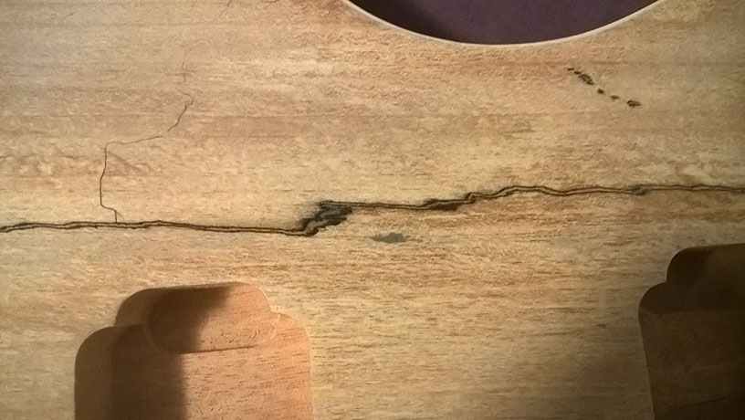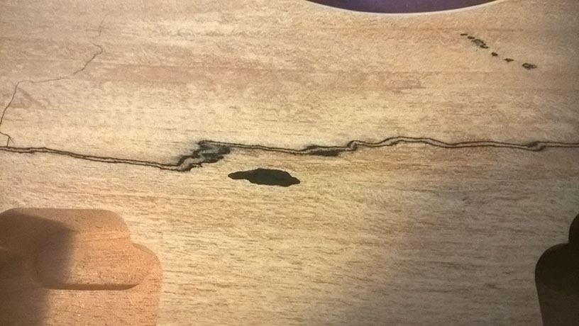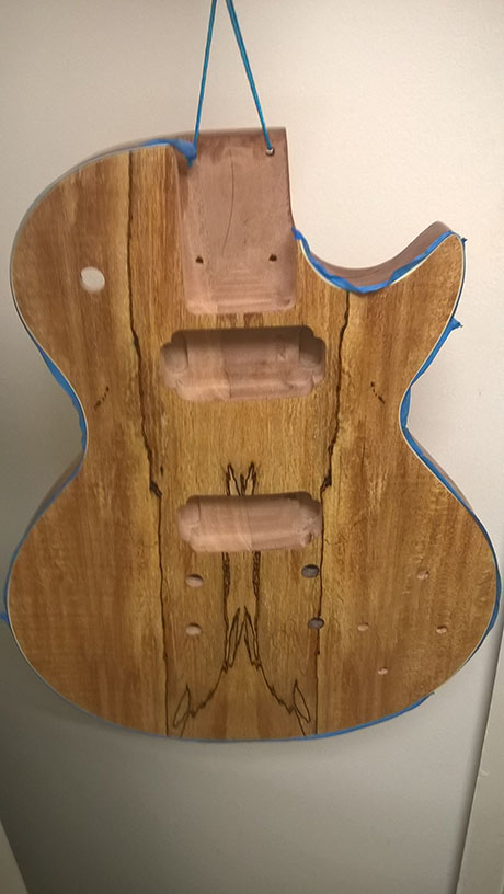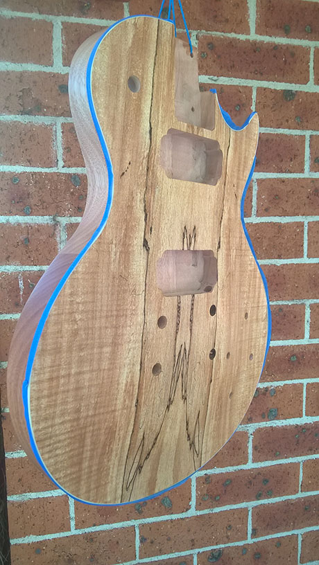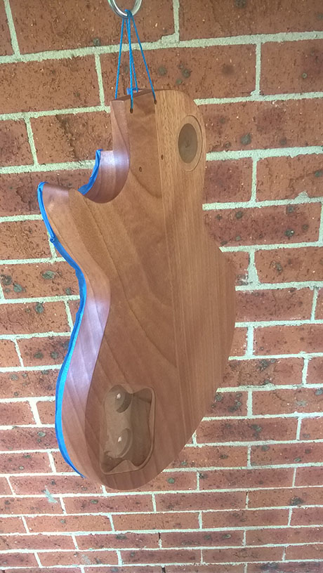 So much sanding. And just when I thought I'd finished, I noticed I'd managed to take a piece out of the top veneer. So in went the ebony timbermate and now the guitar almost has mirror image scars.