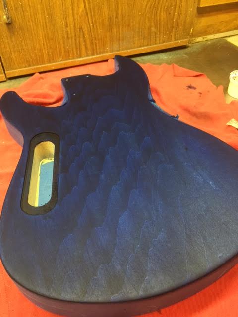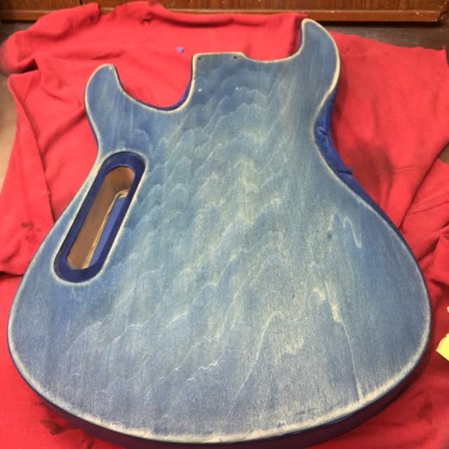 Just an update on the guitar, given the back its initial dark blue stain. Its a lot more royal blue on the back than the photo shows. The sides will be left natural and the front will be a stunning lighter blue finish showing the grain. Unfortunately the photos dont do it justice but once oiled it will look a treat.