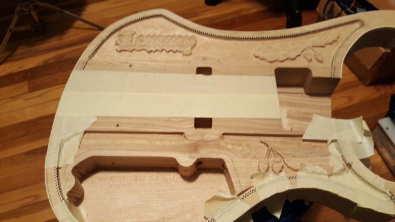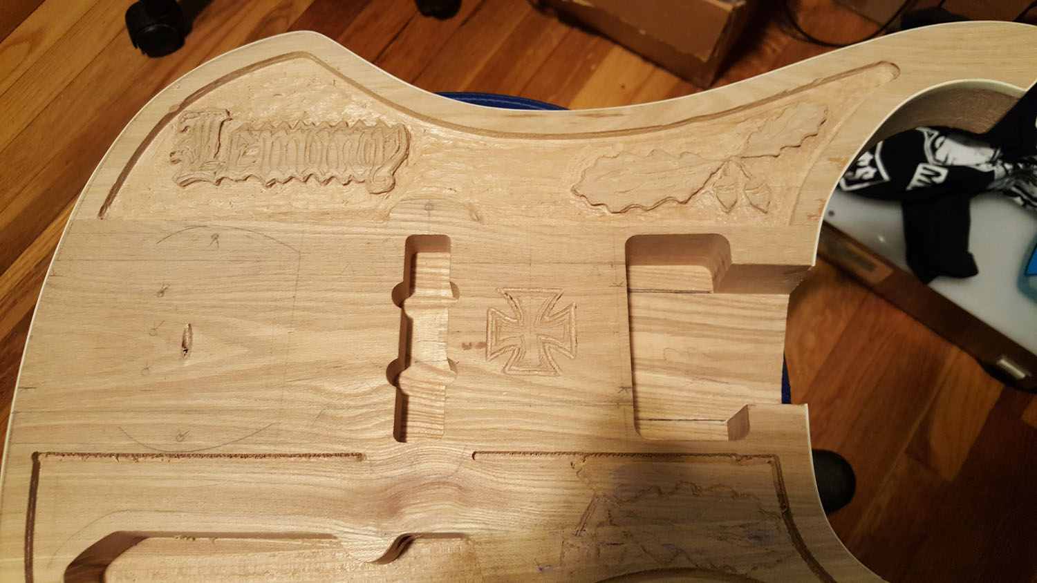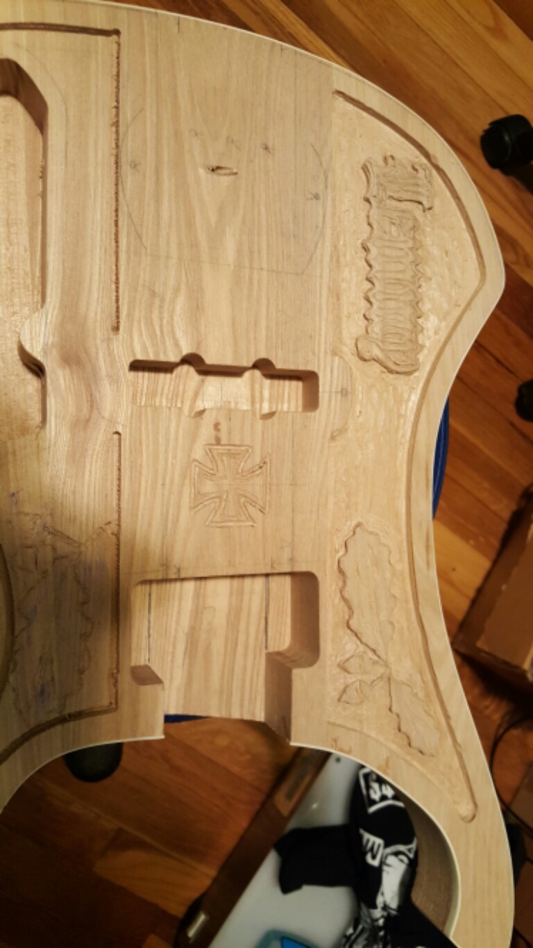 I am past the point of no return! I learned something today.. .. Don't route out the boundaries of your carving areas before you carve.. seemed like a good idea until I slipped across the channel with the dremel and took a few nice chunks out of the side that isnt supposed to have any chunks out! I think I have an idea to fix that though...stay tuned for that. The carving is going fairly well. Im doing a combination of hand gouges and dremel. I started by drawing a pencil outline on the wood and engraving it in with the dremel, then went to town on it. I really wasnt sure until I got going.. now, I'm pretty happy. I still have a ton of shaping and smoothing to do, but it's getting there! I didnt want to do a Lemmy replica, but wanted to tribute HIM as well as his Ric... Enjoy the pics... more work tomorrow!!