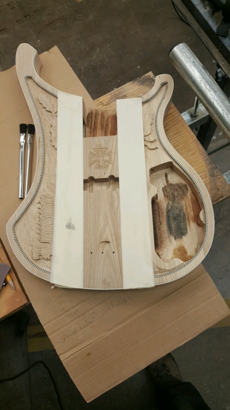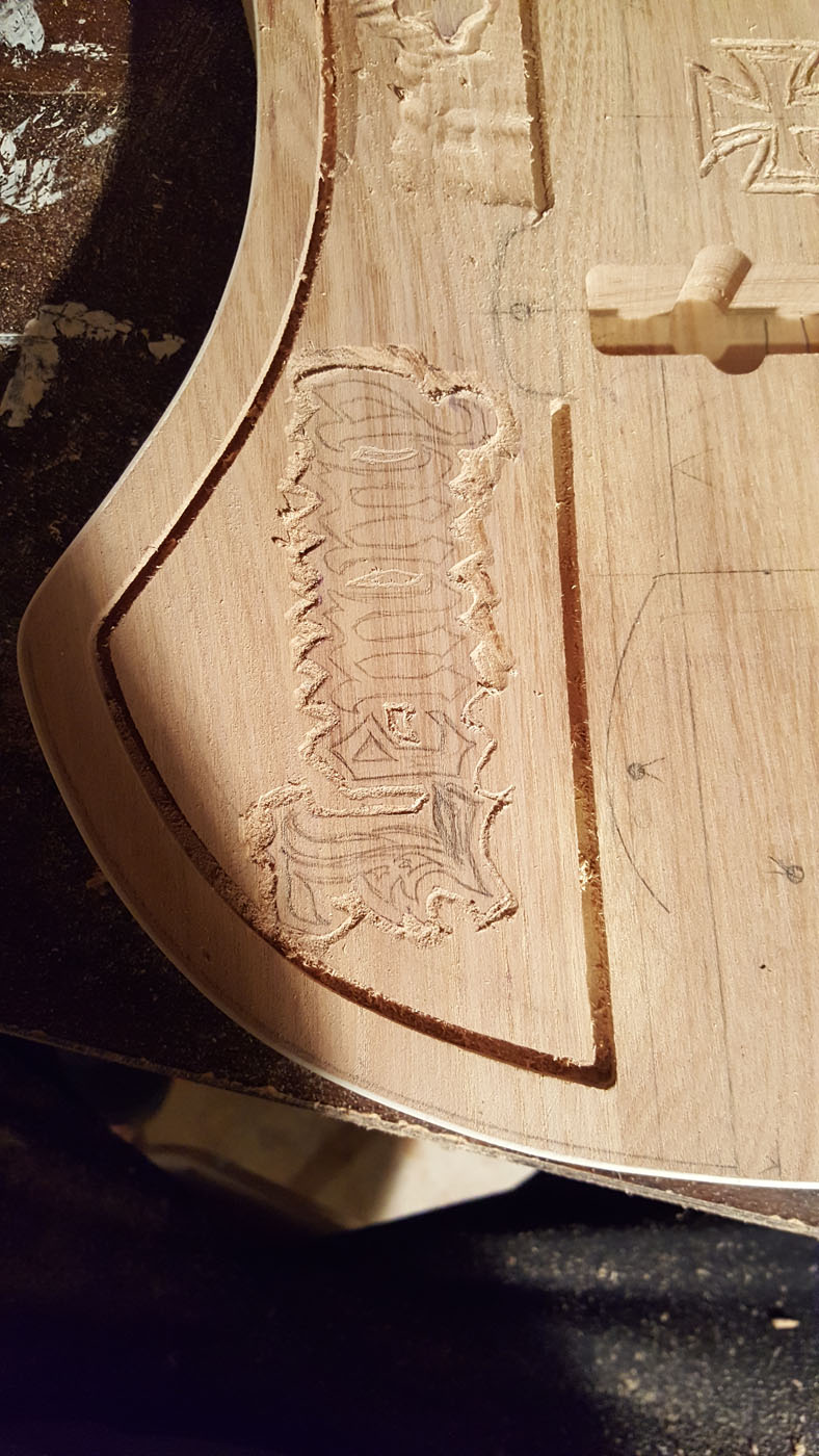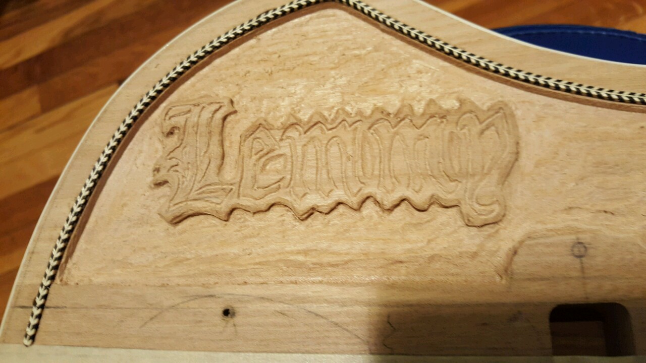 I am past the point of no return! I learned something today.. .. Don't route out the boundaries of your carving areas before you carve.. seemed like a good idea until I slipped across the channel with the dremel and took a few nice chunks out of the side that isnt supposed to have any chunks out! I think I have an idea to fix that though...stay tuned for that. The carving is going fairly well. Im doing a combination of hand gouges and dremel. I started by drawing a pencil outline on the wood and engraving it in with the dremel, then went to town on it. I really wasnt sure until I got going.. now, I'm pretty happy. I still have a ton of shaping and smoothing to do, but it's getting there! I didnt want to do a Lemmy replica, but wanted to tribute HIM as well as his Ric... Enjoy the pics... more work tomorrow!!