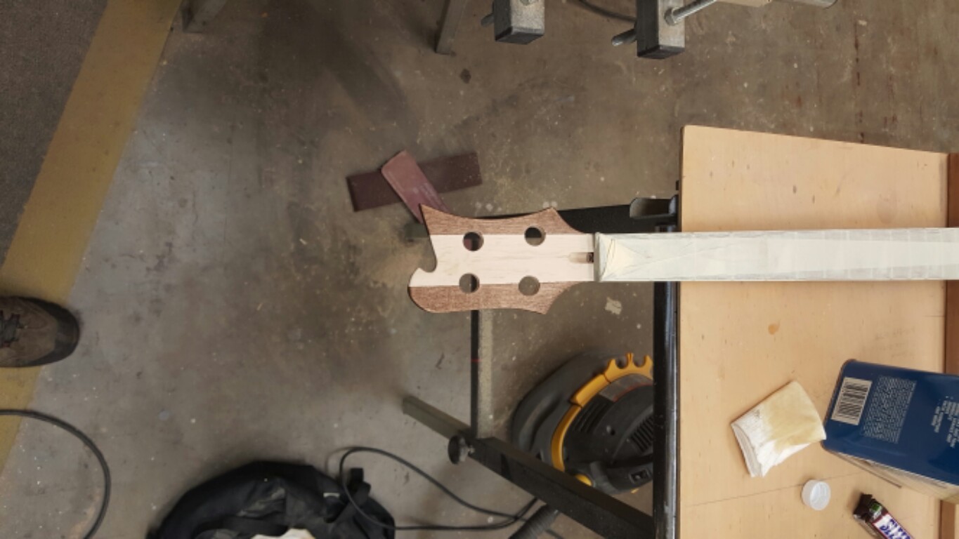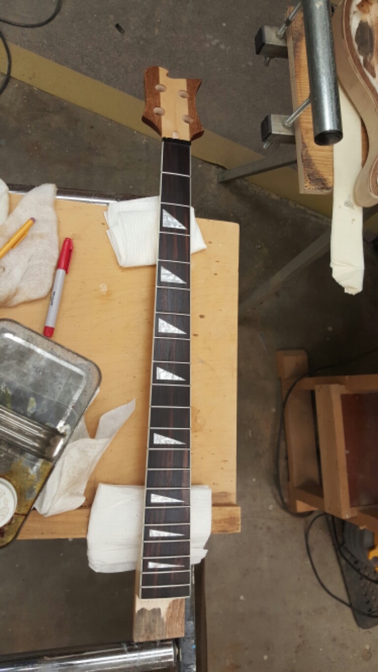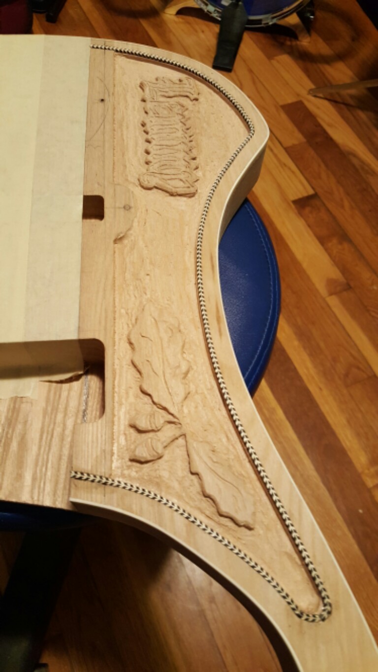 Hi all... I have been working like crazy on the bass every chance I get. Ive been taking pictures, I just have to resize them to post.. The carvings are done.. I ended up using the black and white binding stuff (which is more like purfling), to fix the chunks I took out of the edges.. Im glad I did. It looks really sharp! I did some stain tests in the cavities and chose my stains. I am leaving the neck natural, with a Behr Tung oil based, wipe on varnish.. Its smooth as heck, and satiny-low /gloss. Sand, sand sand and the front is stained! I had a bit of a setback today.. Im a moron, and assumed that Id be able to scrape any stain off of the binding... the cream was a piece of cake, but not so much with the black and white stuff. I ended up removing it (pain in the a$$!!). In doing that, I put a couple scratches in the field of wood around the edge.. soooo.. sanded the areas back, scratches out, re-stain, move on. I replaced the binding stuff, and made my flush-mount, walnut cavity cover. It started as a 3/4"(19mm) thick board.. thank god I have a thickness planer at work! I got it to about 3-4 mm, and it fits perfectly flush with the top... the pictures will make sense of what I just said..lol. I also made my pickup ring from the same planed piece of walnut... Next, I will move on to the edges, which will be stained black. Ill probably sand the back some more, and then I am creating a new "color" for the back. I will explain that when I post pics! Lol...