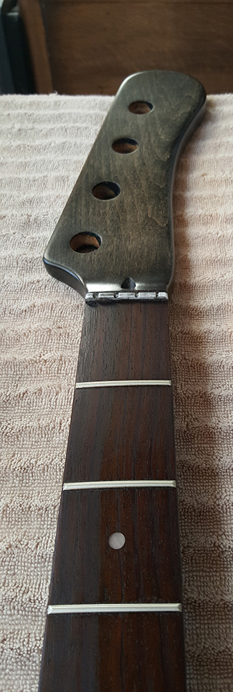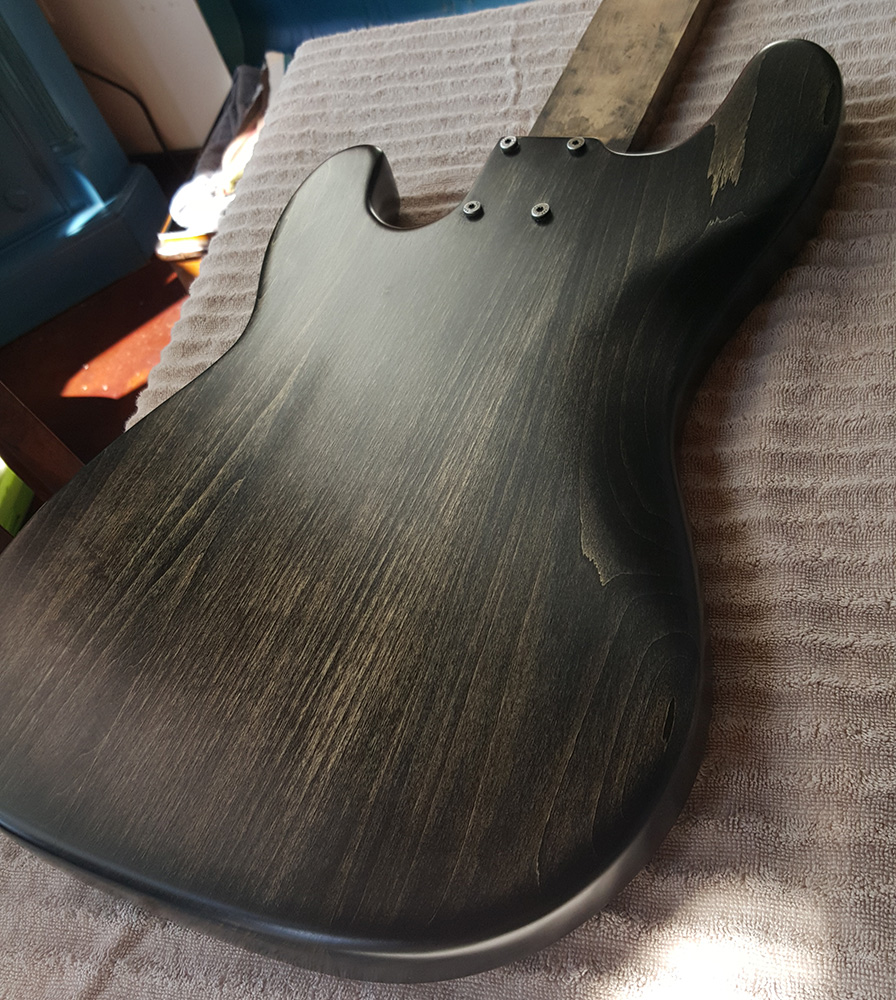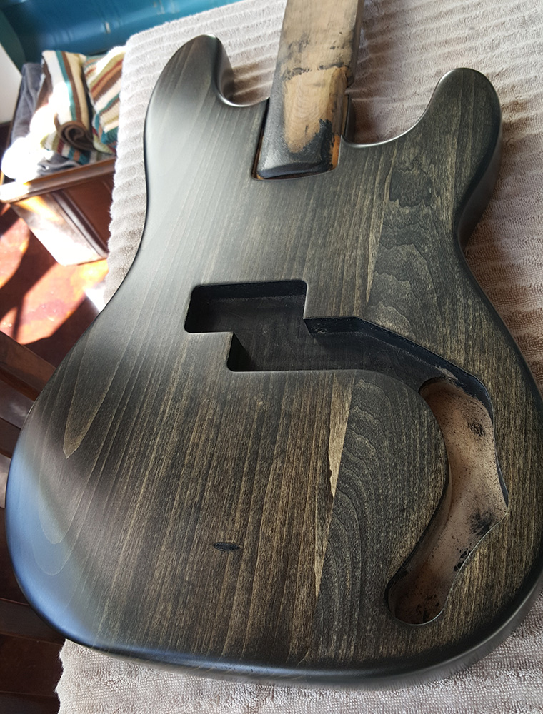 You can see in that last photo how there are two very different (hardness? grain pattern?) looks of the wood. It is kind of weird. The grain is a lot more open where it looks "duller" in the picture. Absorbed a bit more stain too so it is a little darker. Not sure what it is, but the fretboard oil really brought out the difference. Going to put a couple more rounds of oil on and see what that does. Don't want to go too thick on that so I'm being super careful. If it stays like that, I can live with it. The little bit of dark stain on the fretboard really makes it pop though. I'm really happy with how the curves and edges turned out. I took a lot of time to sand with some super fine scoth brite to get some gradation in darkness of the stain. Kind of like a burst I guess but it is more like it accentuates the natural shadows to give it a lot more depth. The photos don't do a good job capturing the subtlety especially around the edges. It looks more like a solid border.