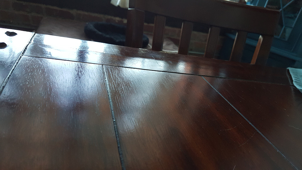 As long as I was working on the guitar, I did a round on our table since we are trying to sell it before the move. This is with the polish. Figured I'd take a pic since I'm sitting right here and it is a good example. Nice and shiny. If you buff it lightly, it is more semi-gloss. If you go for it, you can get it very shiny. It even fills in minor scratches like cat claw marks (little bastards). Speaking of which, excuse the cat hair.