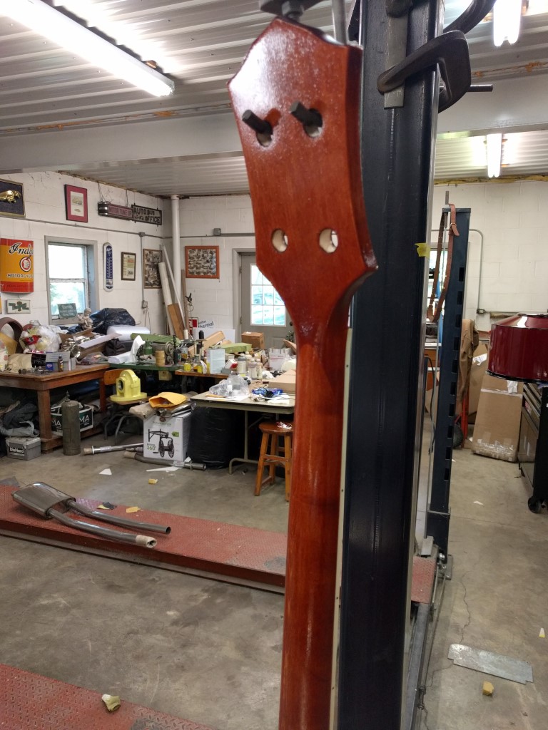 We can't take credit for the idea of the suspension jig. I saw someone else's build thread where they were finishing the body of their guitar and had it suspended via what looked like a clothes hanger through a pot hole in the face. We figured, why not do that with the whole guitar? I didn't have any input into the hanger design, though. That was entirely my old man's work. And I think he did a good job. The cotter pin in the top is a VERY good idea.