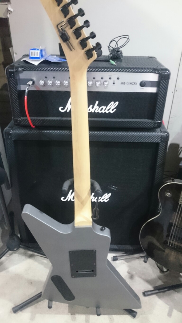 Time for another entry, here is my "Battle Axe". It is a custom 24fret EX-1 with sharktooth inlay and floating trem. I finished it in kind of a hammered/textured paint job with some norse symbols (body- Odin triskelion and truss rod cover- troll cross) and runes (translates to "Iron Vengeance". I also chucked an Entwistle X3 in for the bridge pickup and fit a trem toolkit to the back of the headstock. It was shipped with the wrong colour neck nut and I am waiting on the correct one but other than that it's all good to go. Anyway here's the pic's.
