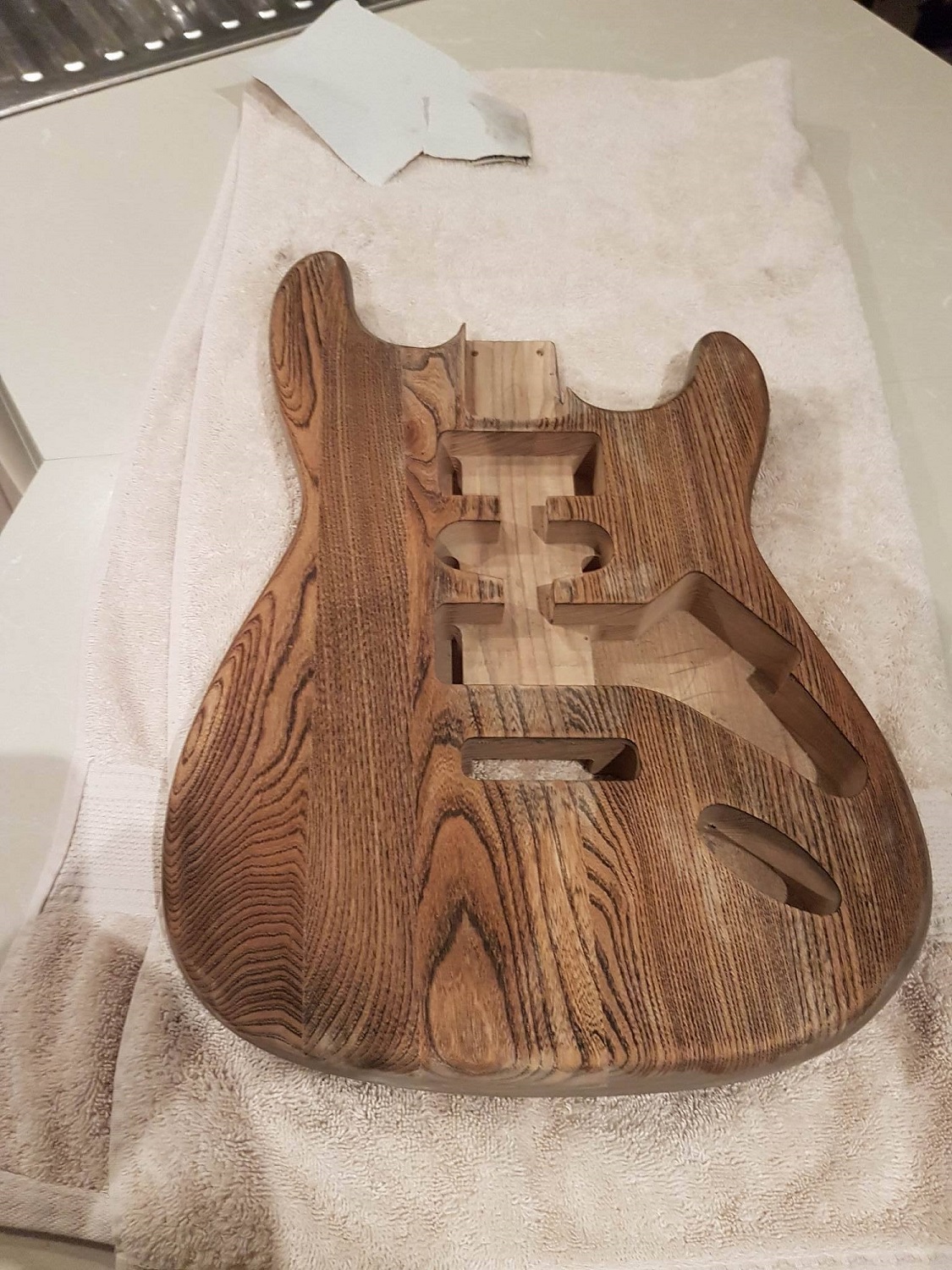 Eric looking good you scored some awesome ash grain in the body. Look forward to seeing deep red stain on it should look unreal
