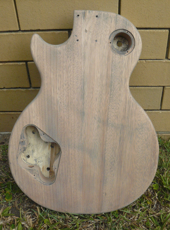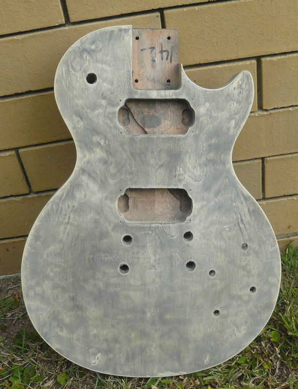 I didn't want Wokka to cry over a painted veneer so I did a timbermate slurry on the body today :p. I MAY be able to do a grey dye job with a slight burst/fogged edges and save the veneer. There is a couple of glue spots but I may be able to camouflage them. Top sanded with 320, back with 220