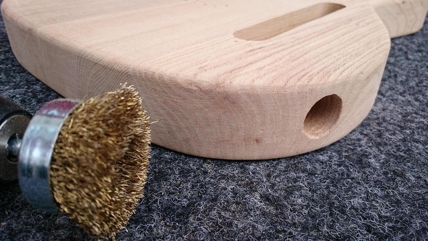 the first step in "distressing" the wood is close to done. I found a great youtube video on how to take out some of the softer wood between the grains with a power drill and a brass brush (or something). took it with the grain and her are some results. Maybe gonna work on it little more to tidy the grooves up a bit or not.