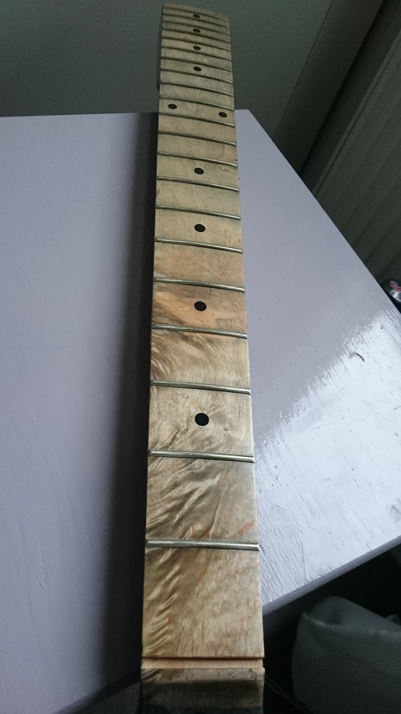 I really love the flames on the fretboard. Gray stain sanded away and TO on the neck.