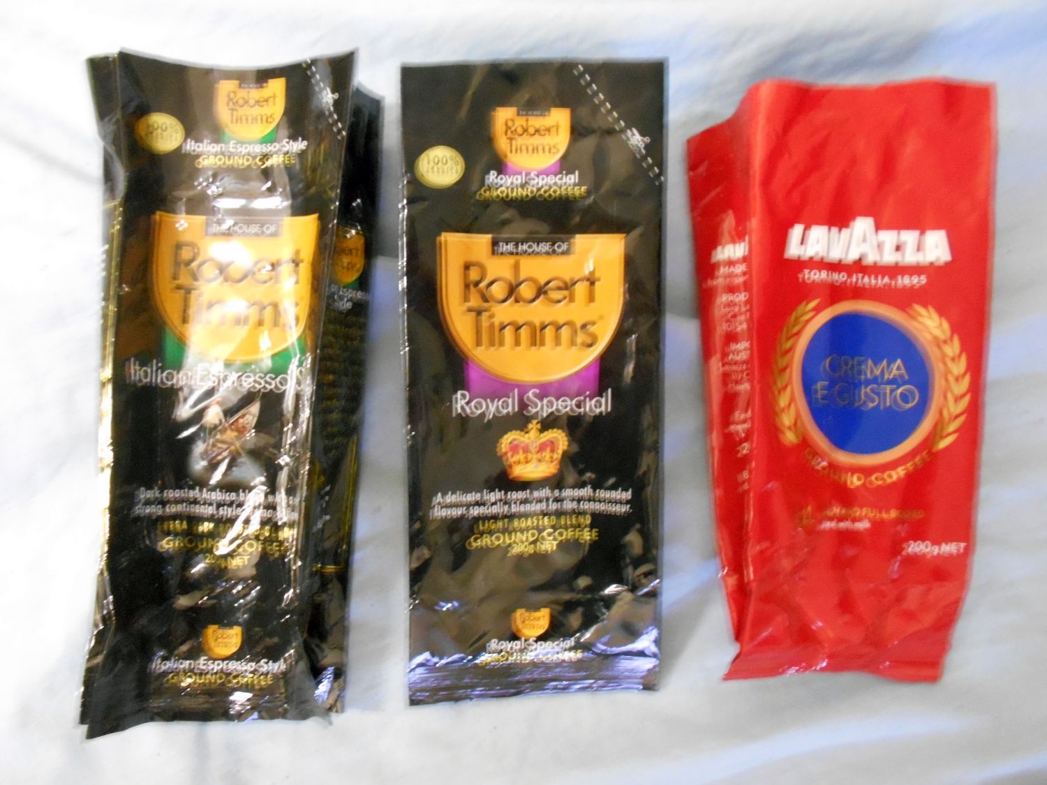 On the left is Robert Timms Italian Espresso Style, the middle one is Robert Timms Royal Special, and the one on the right is Lavazza Crema E Gusto, all are pretty good tasting, much better than the instant coffee I usually buy, I'm currently making myself a cup of the Robert Timms Royal Special coffee.