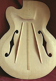 This prompted me to look for the construction methods used in archtop guitars. I came across this page http://www.acousticfingerstyle.com/ArchtopGuitars.htm which has some interesting facts about the different speeds of sound in wood along the grain vs across the grain, and the reason archtop guitars normally have f-holes at the sides (to decrease sustain), rather than a round sound-hole.