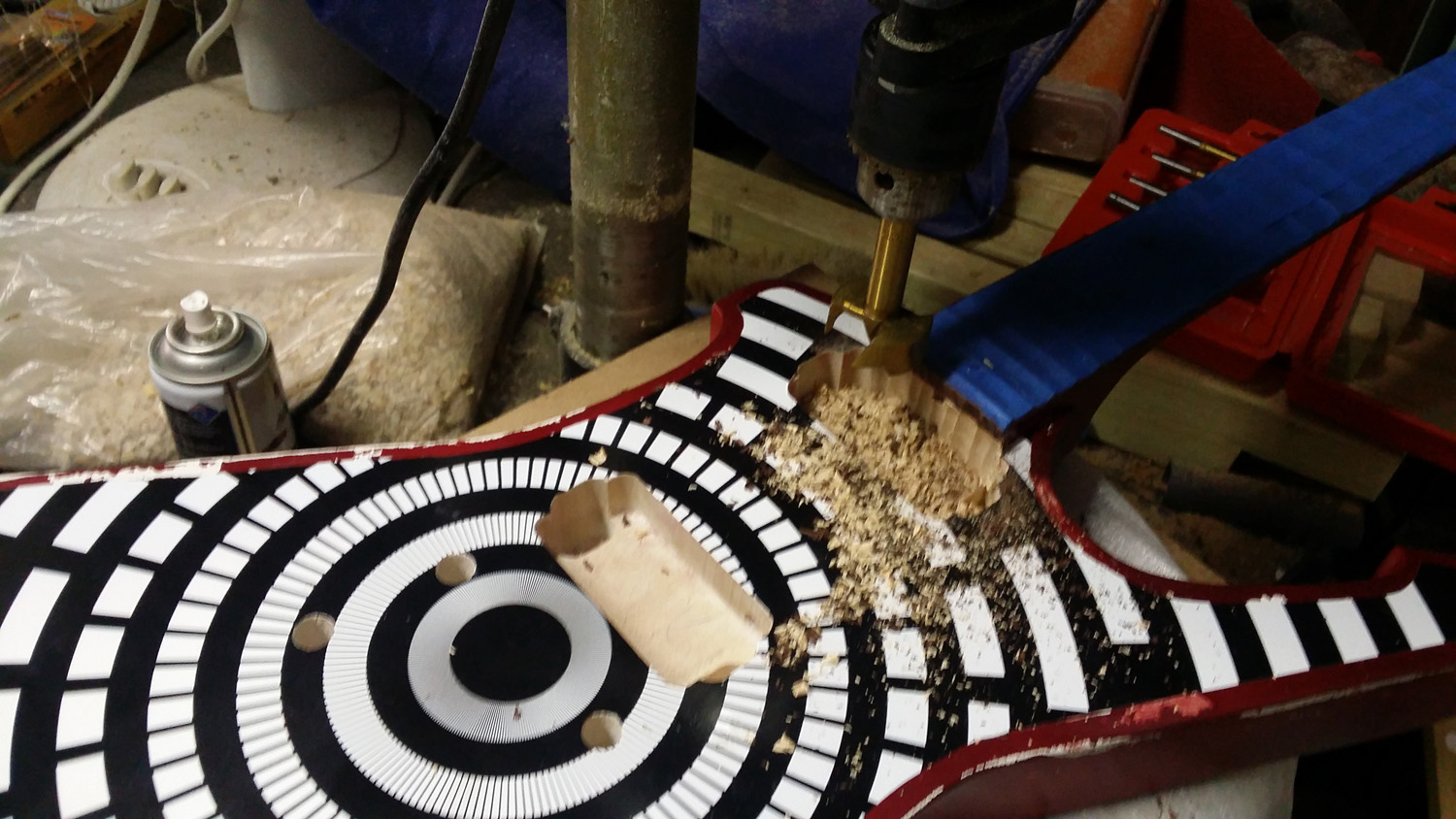 So, not wanting to run a router over it without a some sort of jig/guide, and not wanting to invest the time to creating said jig/guide - I grab my forstner bits and drill out a quarter inch worth of fretboard/neck. I used a small one for the initial drilling, and a bigger one like a router bit to smooth off the edge.