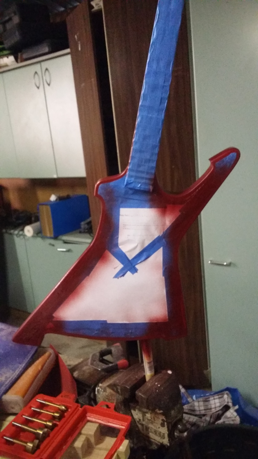 That just wasn't going to work, so I mask up the whole thing, and spray to cover the bit of the neck I'd left unpainted as a glue surface, as well as the bits that had flaked away when the vinyl came up.