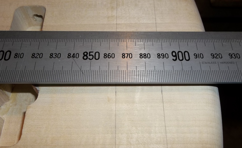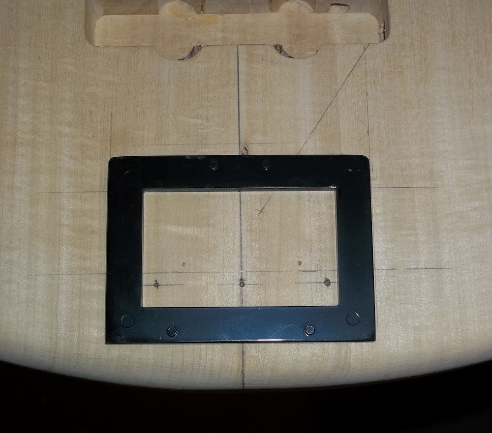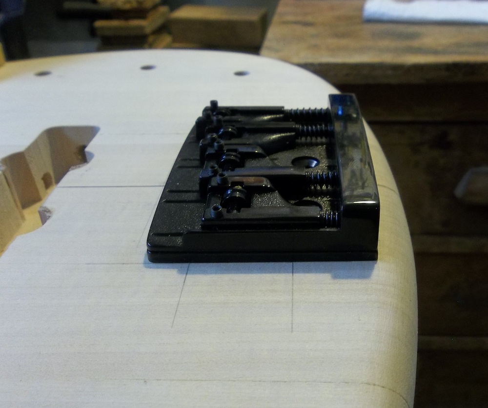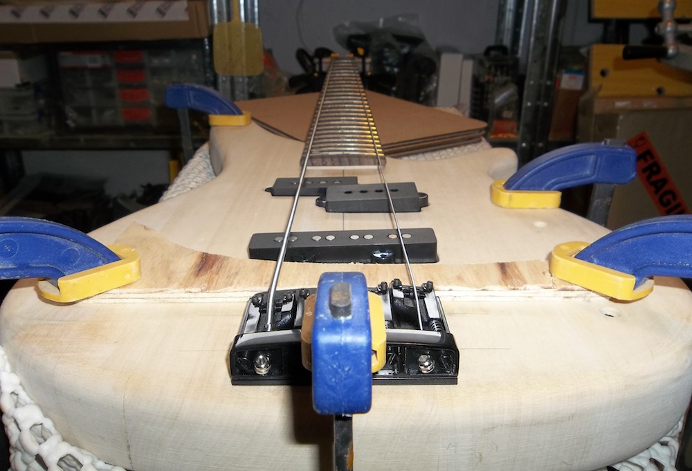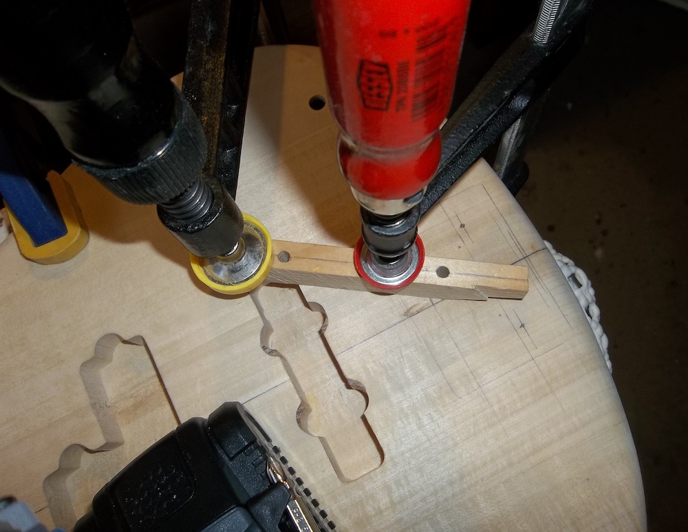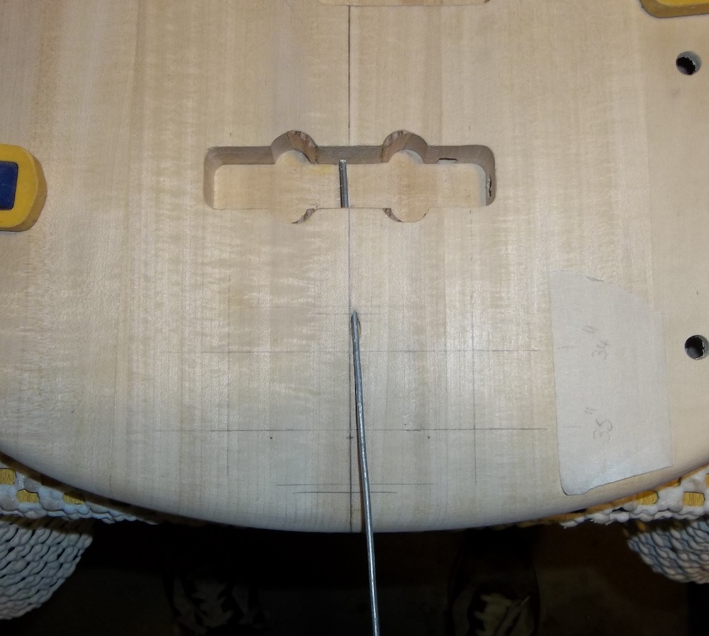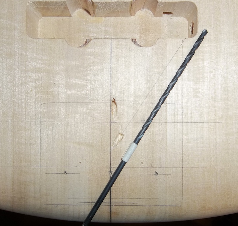 Where possible, I drill the neck screw holes up from under the body while I have it clamped up with the centre line strung (like above), rather than just mark the holes then remove the neck and use a drill press. The latter increases the chance that a screw could pinch in the body and snap… not a happy place to be.