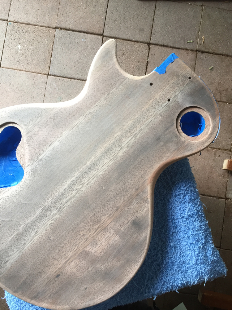 Also finished sanding the body, so put a soak/seal coat of tru oil on the front. Hard to get a good pic in full sun, but I think it's looking ok...