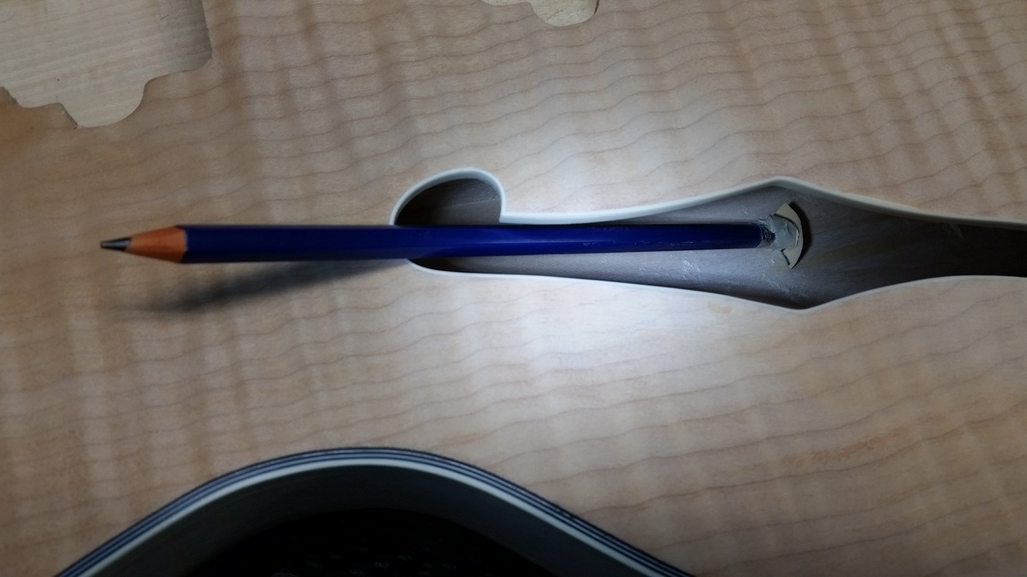 There has been some progress, albeit a bit slow. Spent a weekend afternoon glueing small squares of 150 grit sandpaper to the end of pencils so I could sand inside the f-holes to remove the pencil marks and glue stain. Pencil came off OK but the yellow stain from the glue is there for good, did make it a little less noticeable though. There were a number of pencil casualties.