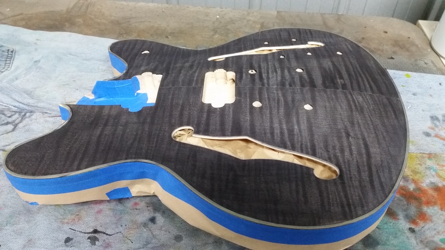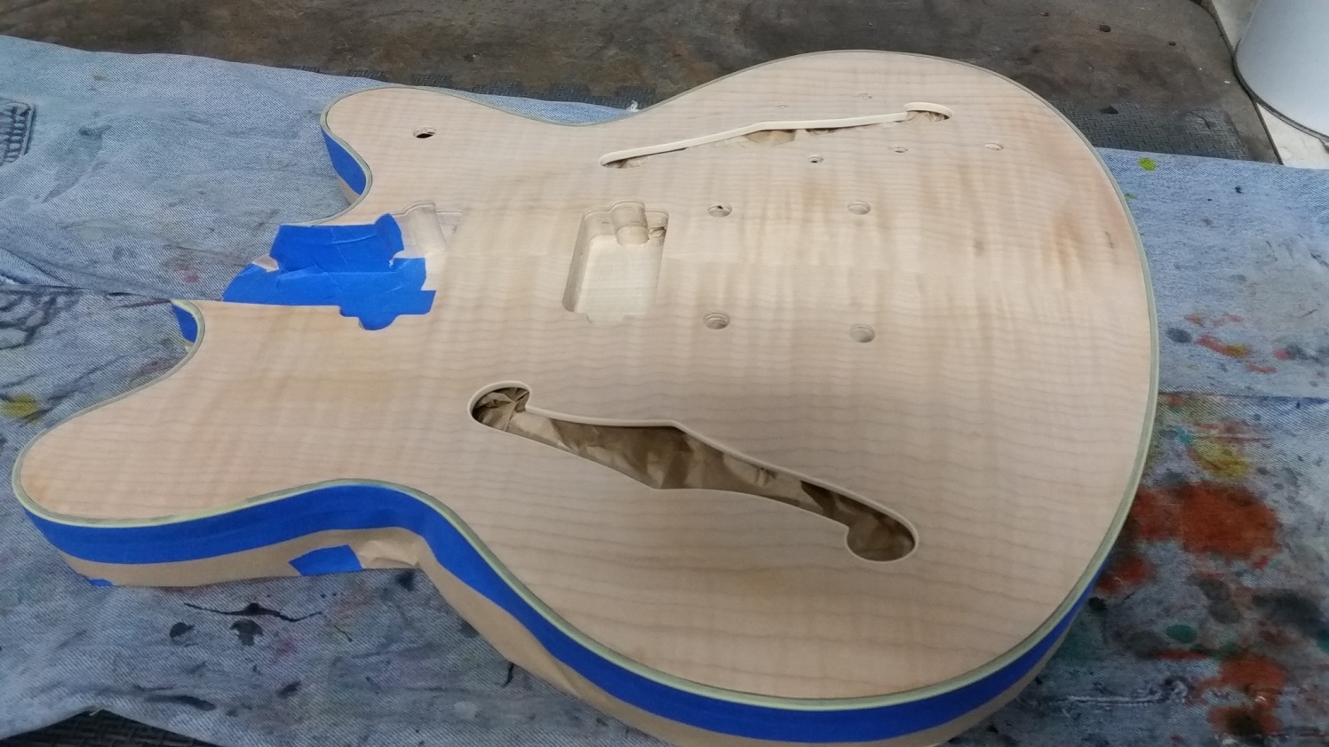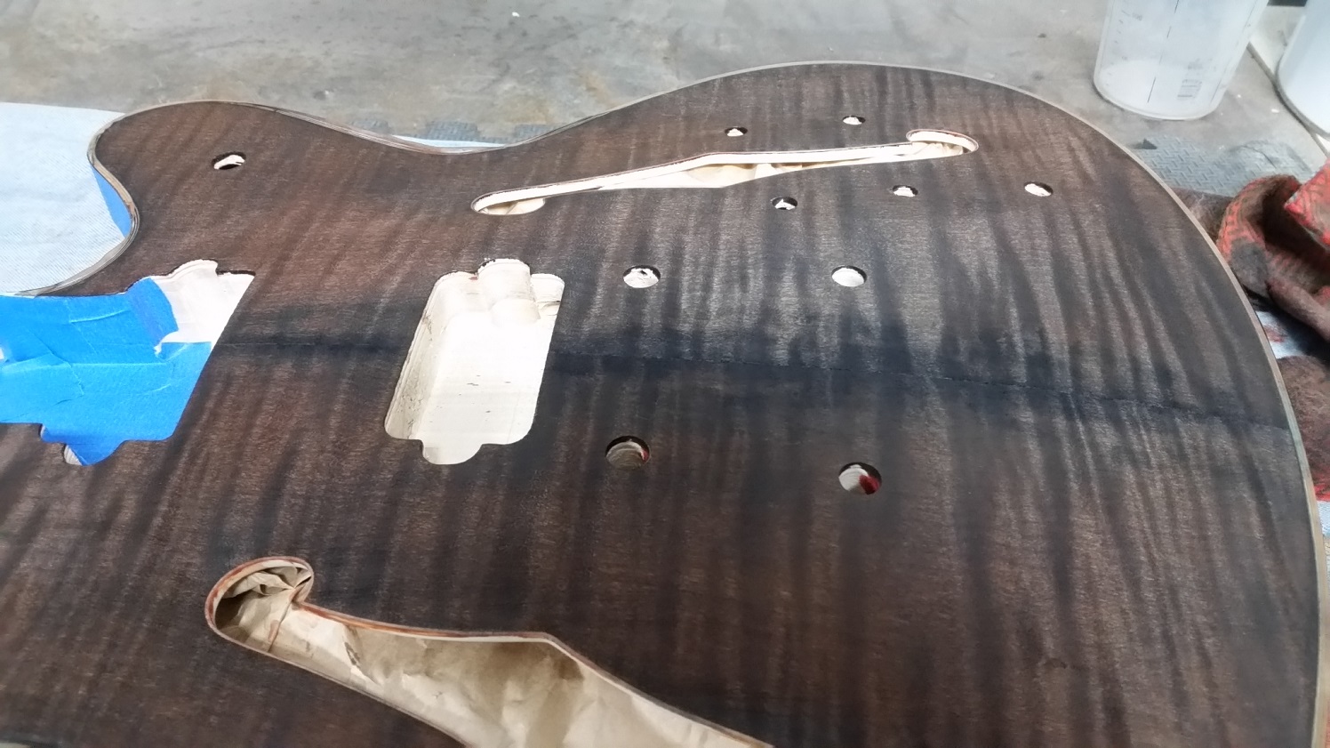 Sanded the side up to 240 grit and had to spend a bit of time alternating between using Goof-off and a small brass brush to remove as much of the glue mark as I could. Then polished the binding with 1500 grit paper and masked up front and back of body.