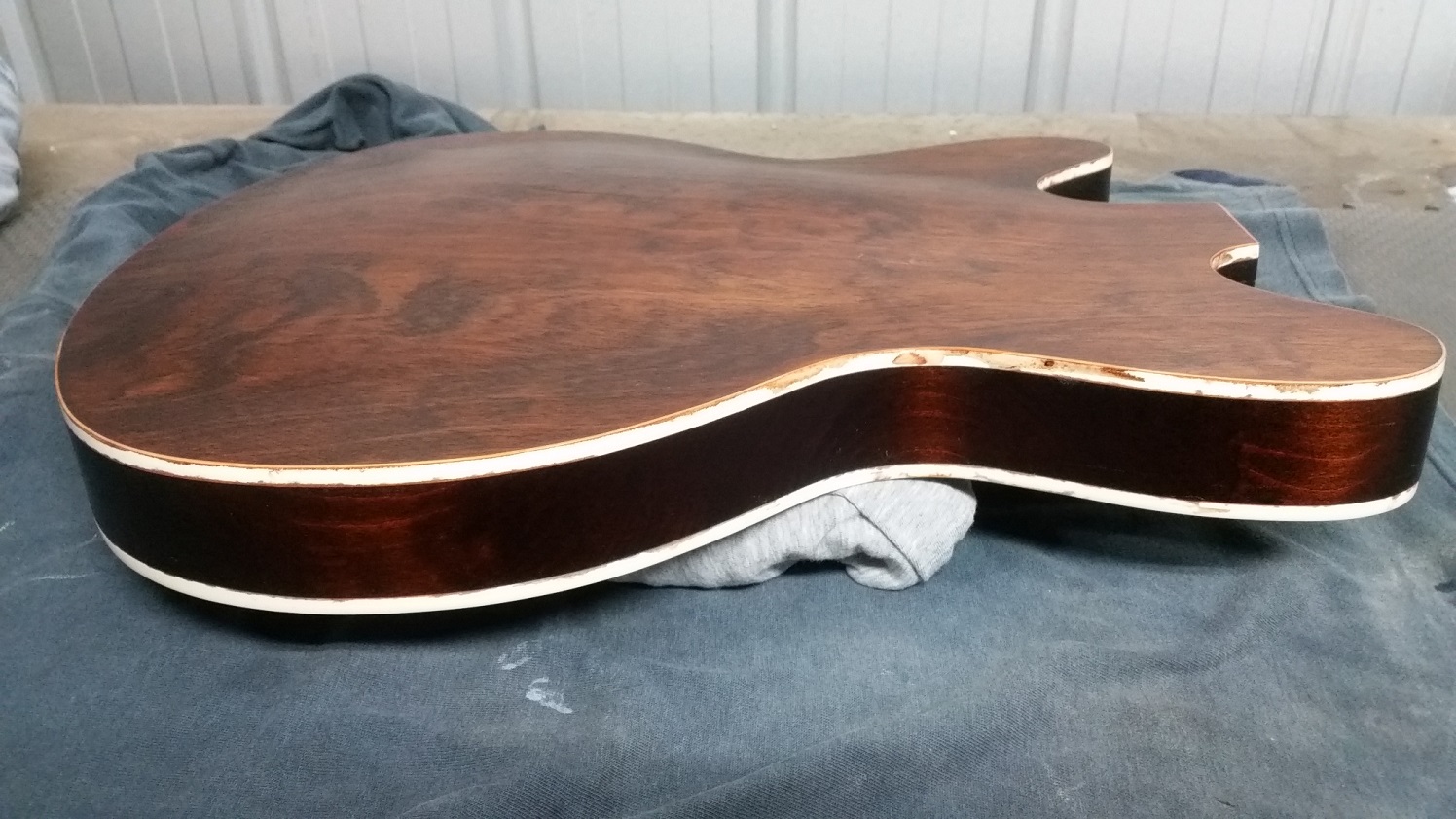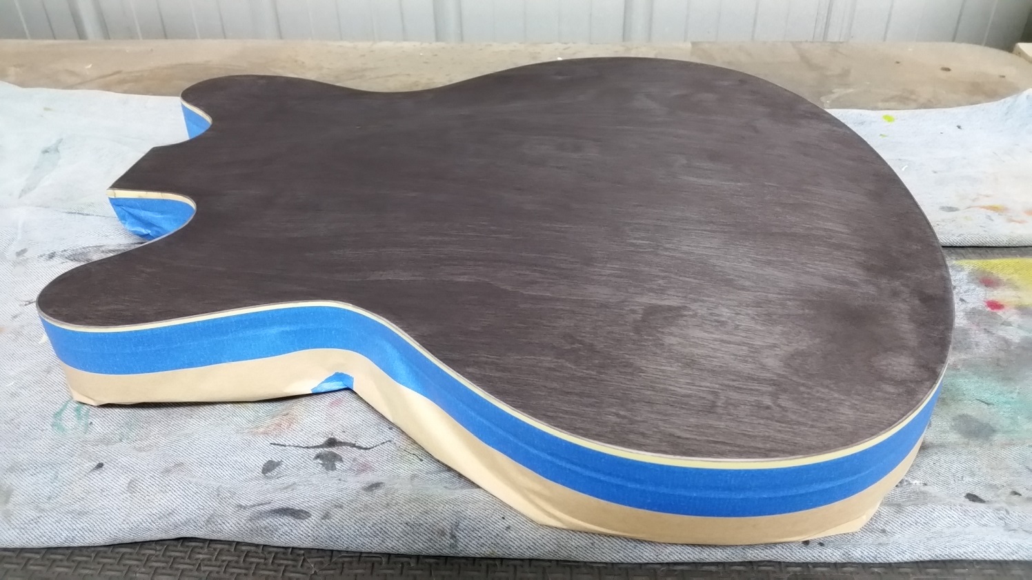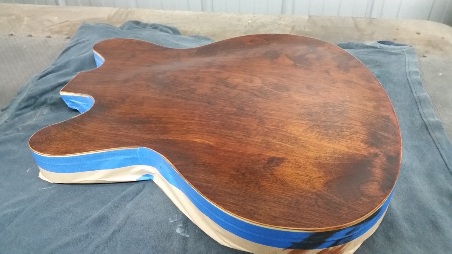 Sanded the side up to 240 grit and had to spend a bit of time alternating between using Goof-off and a small brass brush to remove as much of the glue mark as I could. Then polished the binding with 1500 grit paper and masked up front and back of body.