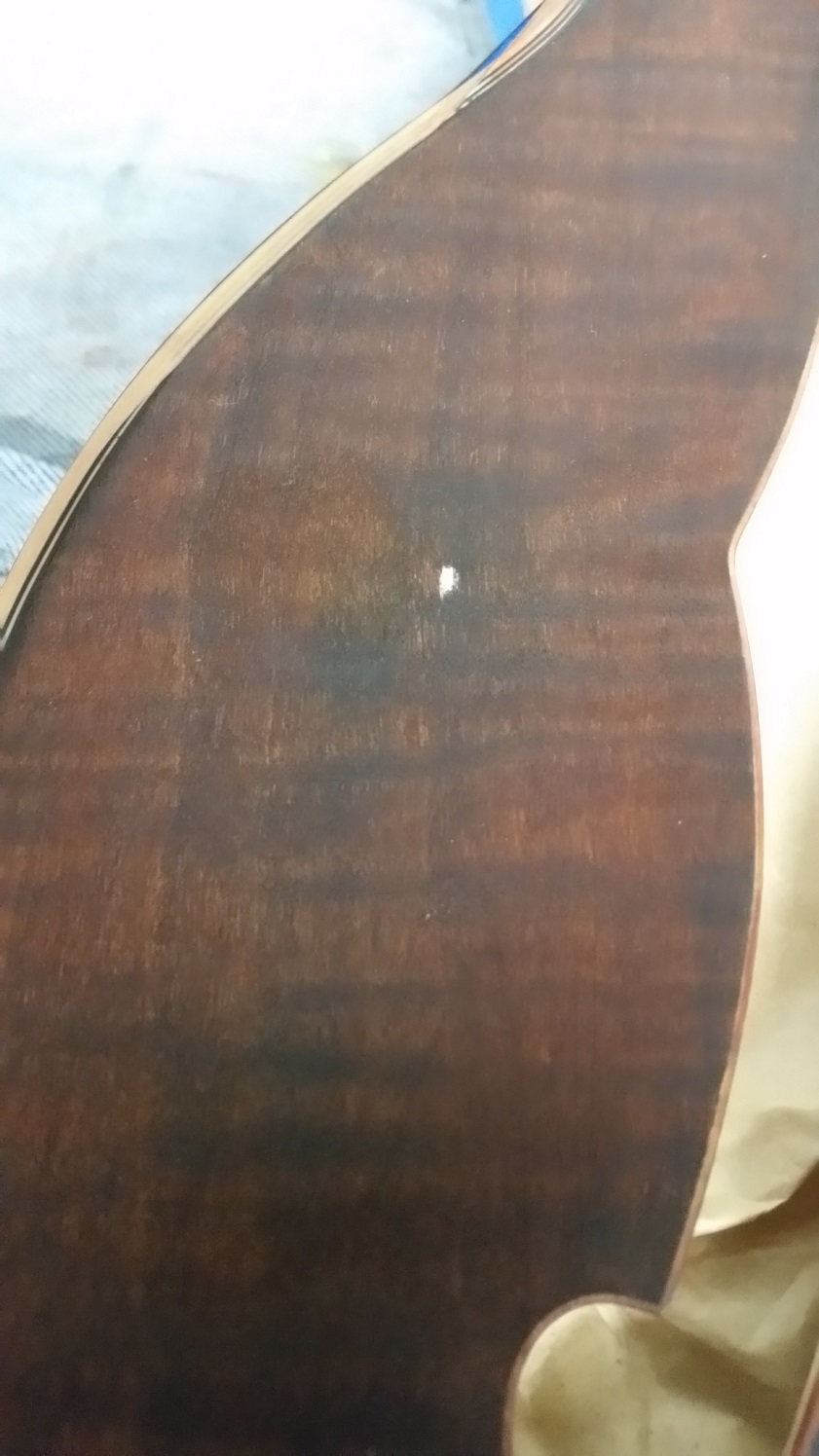 Also had a spot to the left of the left f-hole , it was glue because it shattered when picking at it. Spot filled with natural timbermate.