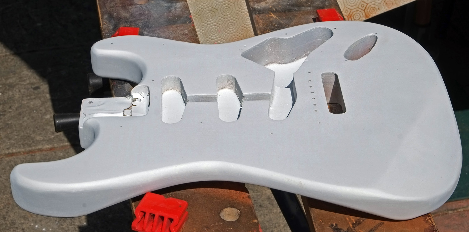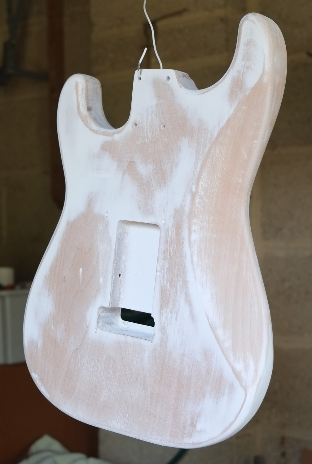 What I've used is actually more of a tinted sanding sealer/filler than a true primer (though it's sold as primer), so I don't intend to use any more of it to get to a solid white. It's quite soft, so I'd prefer to have a minimum of it on the body. The daphne blue is a solid paint, not a tinted lacquer, so will cover up the areas where the wood is showing through a bit.