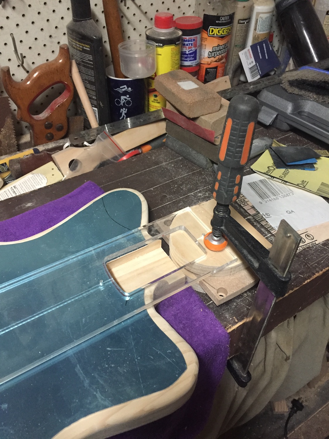 Of course the neck pocket was going to be an issue and with not as much margin for error I wasn't sure what to do... until coming up with this solution: clamping the neck pocket template about 5mm above the body, eyeballing it to as close as I could for alignment accuracy, then sliding in the pickguard and tracing the inside of the template.