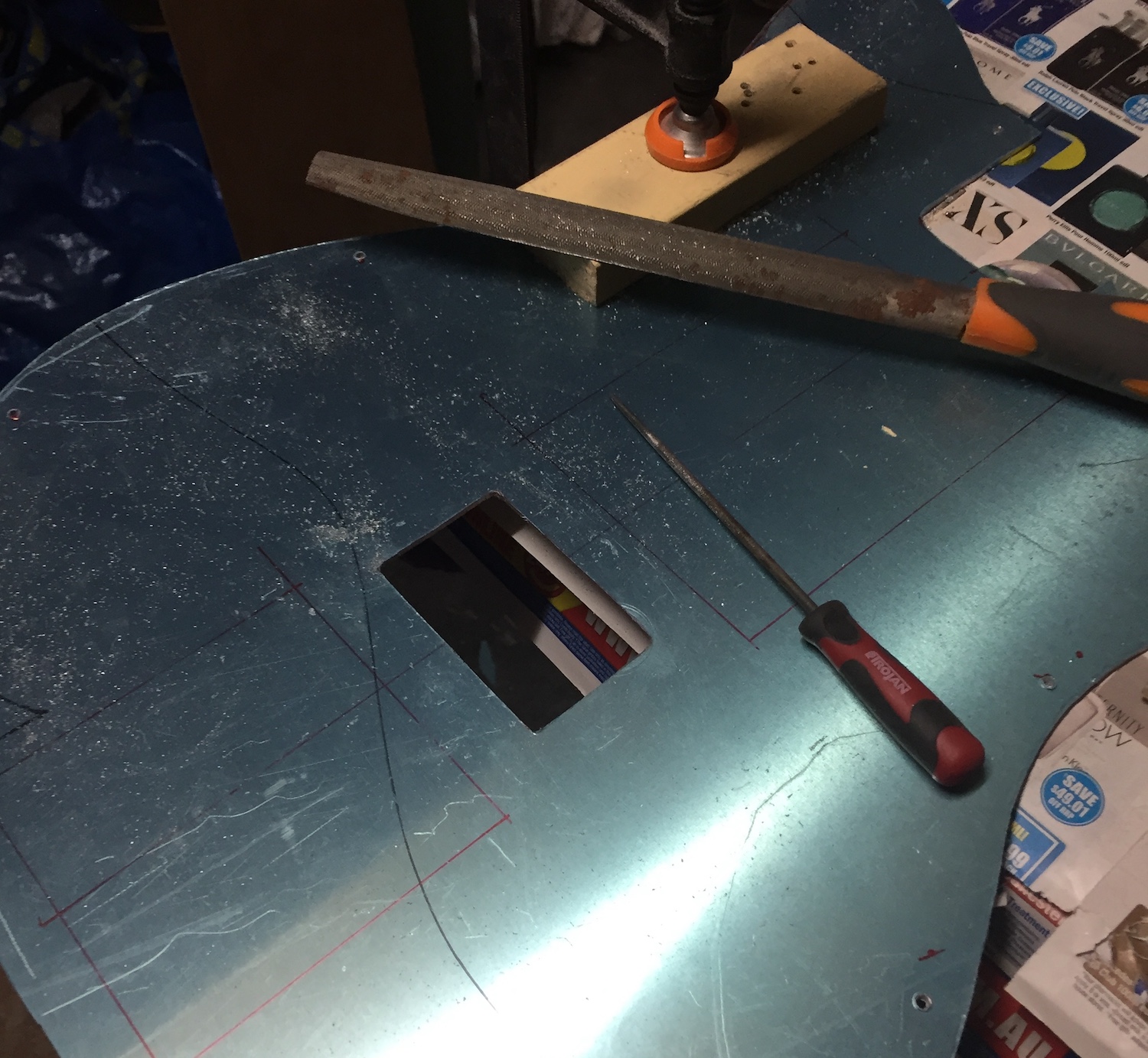 Then drill a hole in it to get the jigsaw blade in, do a rough cutout, then plenty of work with files and I now have a bridge hole!