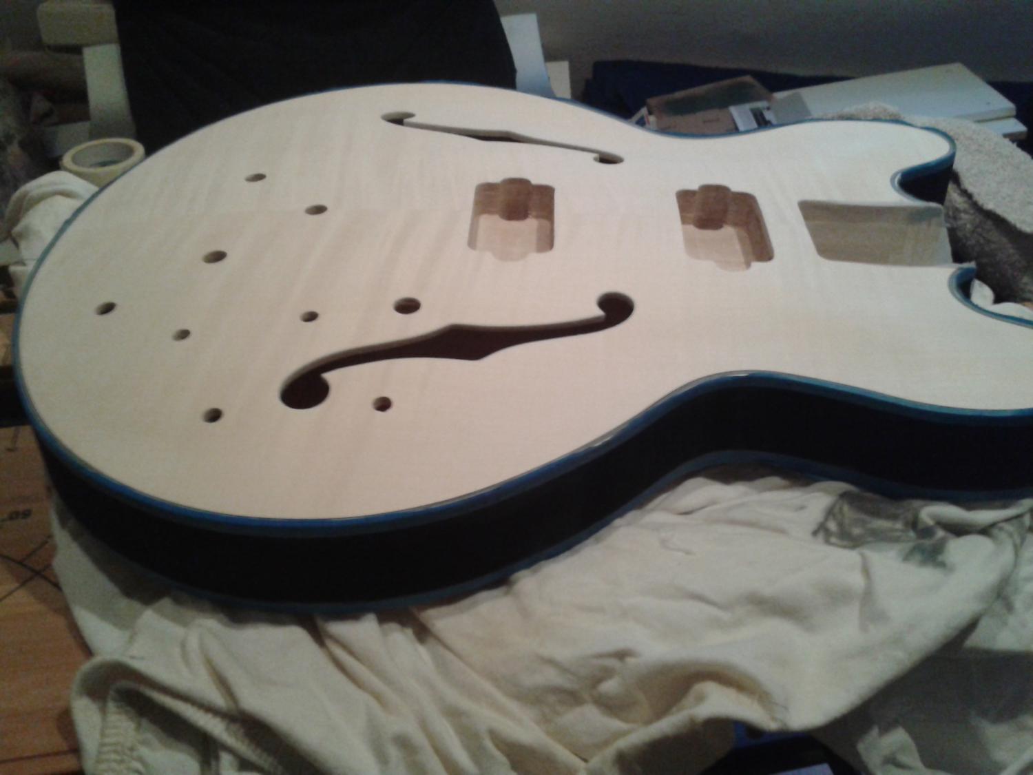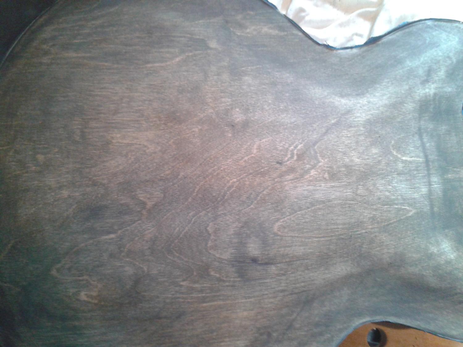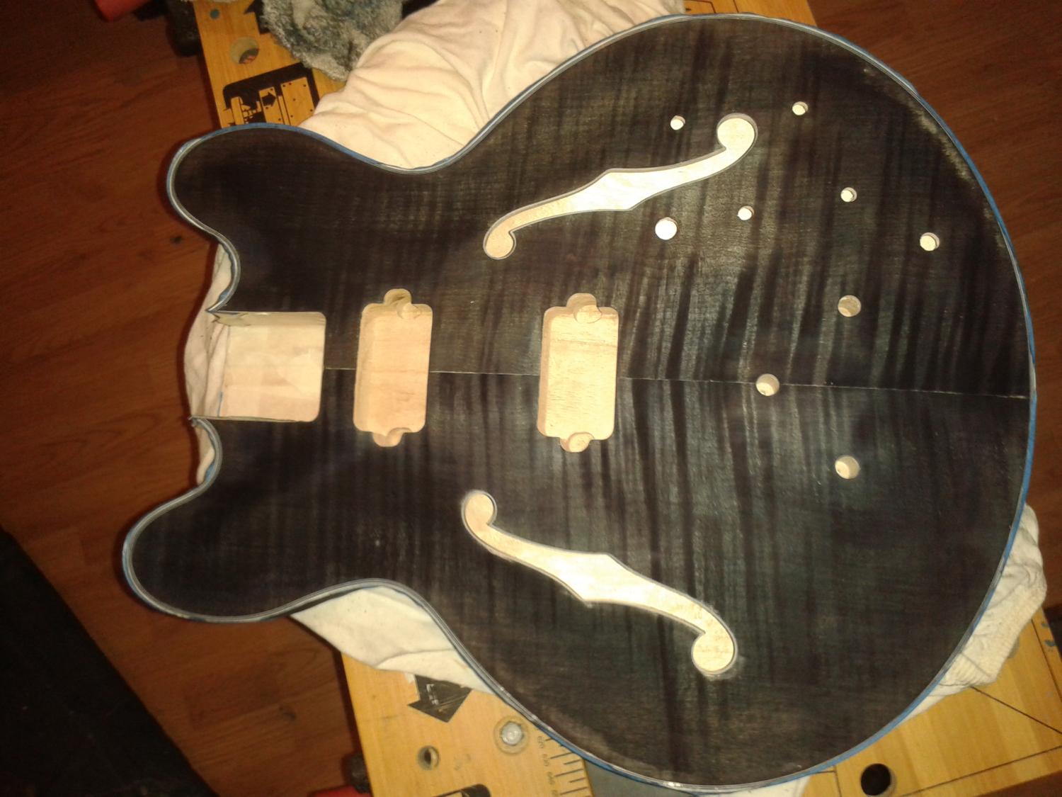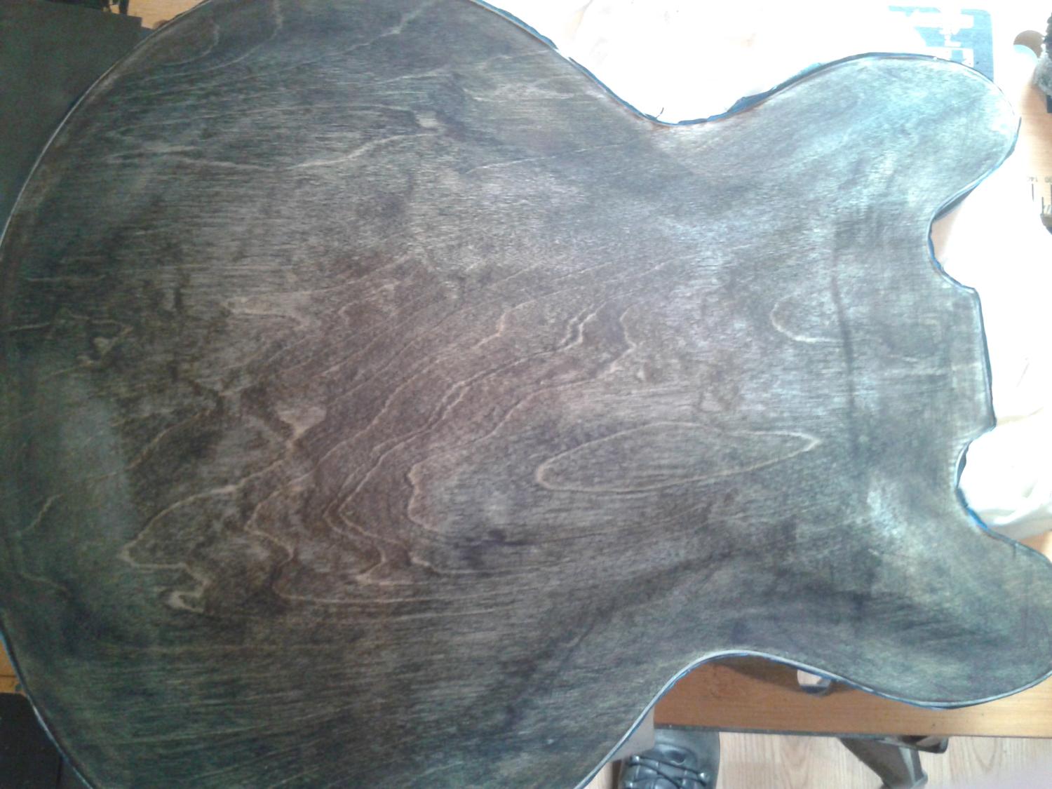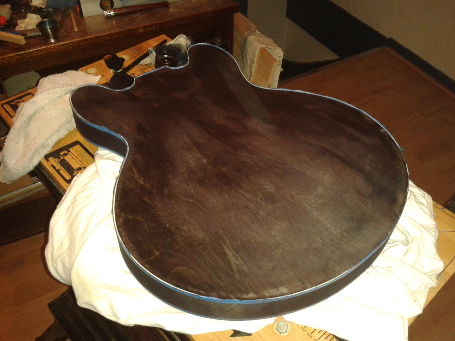 1st coat of in just went on the top and neck.. couple of gluespots on the edge again but like the back that'll be painted over with a burst so no probs..