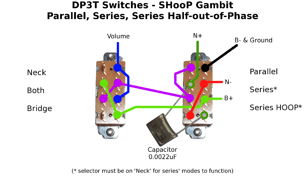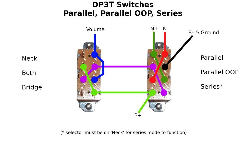2. Doing parallel, out of phase and series switching using a DP3T switch involves a compromise as it really needs to be a 3 pole 3 throw to get all the connections you need. Basically, for the 'series' mode to function the pickup selector has to be set to the 'neck' position. If it's in the middle or bridge position when in series mode the neck pickup gets shorted out and you only get the bridge regardless.