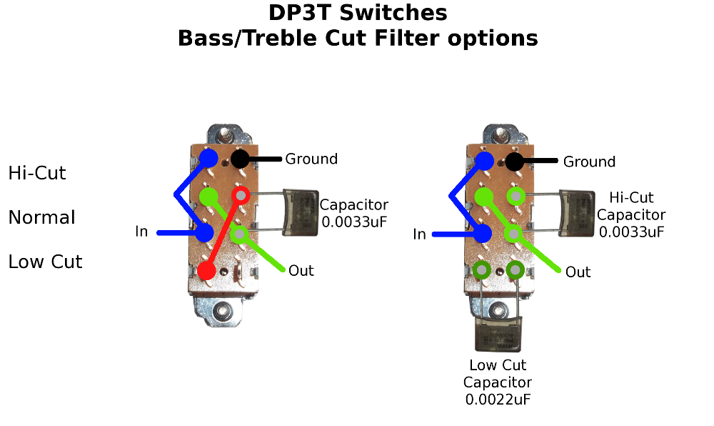 Last diagram is just some tone filtering options. Left is is a single cap version giving both a hi cut and low cut, and the right has separate caps for each filter. Values around 0.0022/0.0033uF will probably give you the most usable sounds, but it's something you need to experiment with for your particular guitar and tastes. From my experience a low cut (cutting out the low end) using a 0.0033 works well, but 0.0022 may be needed to thin it out more. A hi cut with 0.0022 takes off just a bit of the highs, but you may want to go to 0.0033uF or even 0.0047 if you want it a little darker.