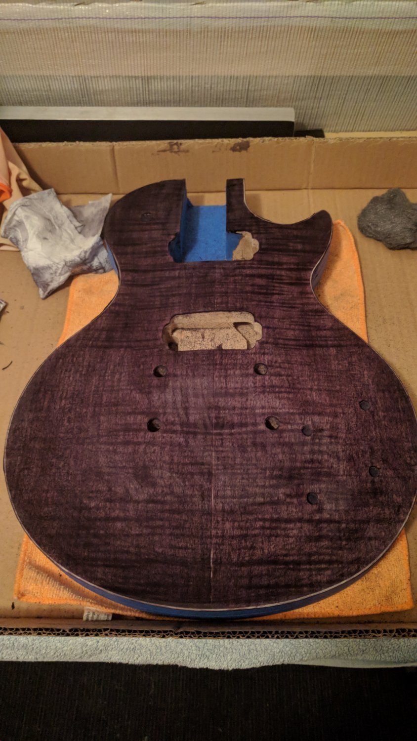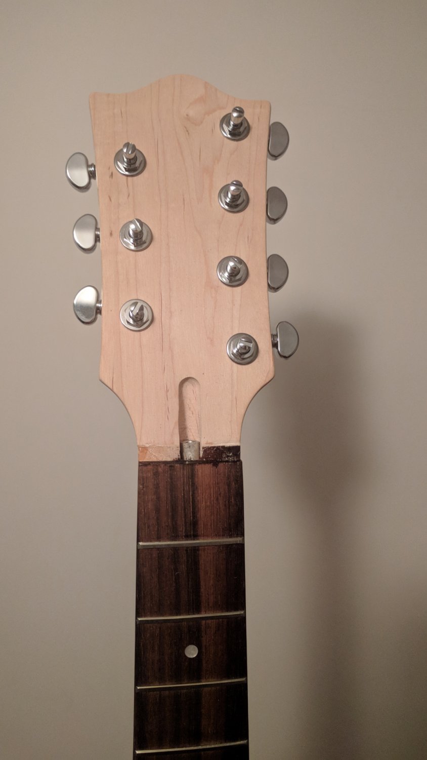 The first thing I did was remove the nut, then shape the headstock. I also took the opportunity to test fit the Grover locking tuners... but I think I'll need to find some different hardware as they look a little weird.