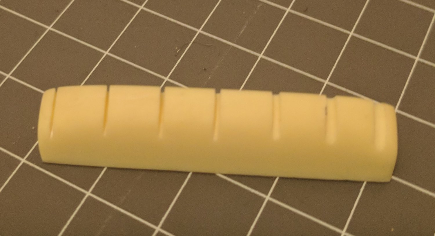 After that, it was time to shape the nut and file it out for the strings. I used 13 - 56 StewMac nut files for this, but I feel the bottom E will need to be a heavier gauge to tune to where I want to on this scale length. It's nowhere near perfect, but that's okay: I'm using this as a learning experience, as I'll try to transfer the skills here to a replacement Tusq nut down the road a little.