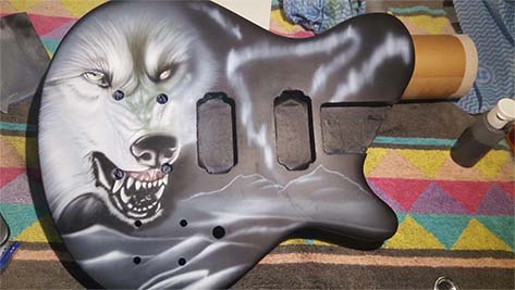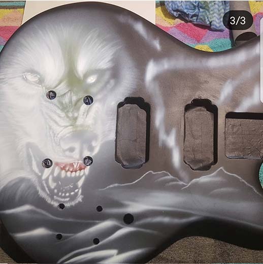 Ok... so where do I begin... Unfortunately I made the huge mistake of being impatient... The guitar was coming along soooo well and I had finished my clear coats when I decided to try polish the guitar... Problem was... I had only waited a few days and the polish went straight through it and got trapped in the clear :( RIP. I then left the guitar sitting there for quite a long time as I lost motivation after this happened. Luckily.. A good friend of mine is a extremely good air brush artist (IG: blackhartairbrush). We discussed what we could possibly do on this guitar to make it unique and look nice as he has always wanted to paint a guitar himself. We ended up coming up with some designs based off a wolf in amongst the northern lights. This weekend he got started on this and I have the first update of this now. Still plenty to do but already happy with how its starting to come out! Will keep this thread updated with progress pics. Cant wait for this to be put together now! Attachment 26193