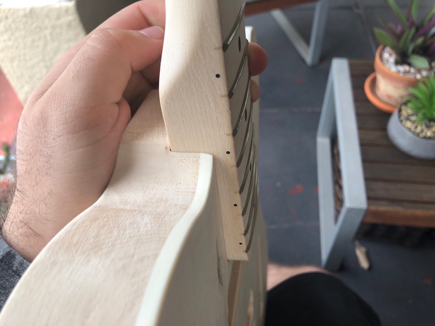 Still reckon you need to temporarily install bridge as mentioned before and also install the high & low E tuners so you can run some cotton or fishing line over the nut and down to bridge saddles. This helps to see how parallel everything is and whether neck is sitting too far to one side or the other. Very handy to know so that you don't sand too much on one particular side when the other may need more attention. This also helps with locating the 'Centreline' of the guitar too.