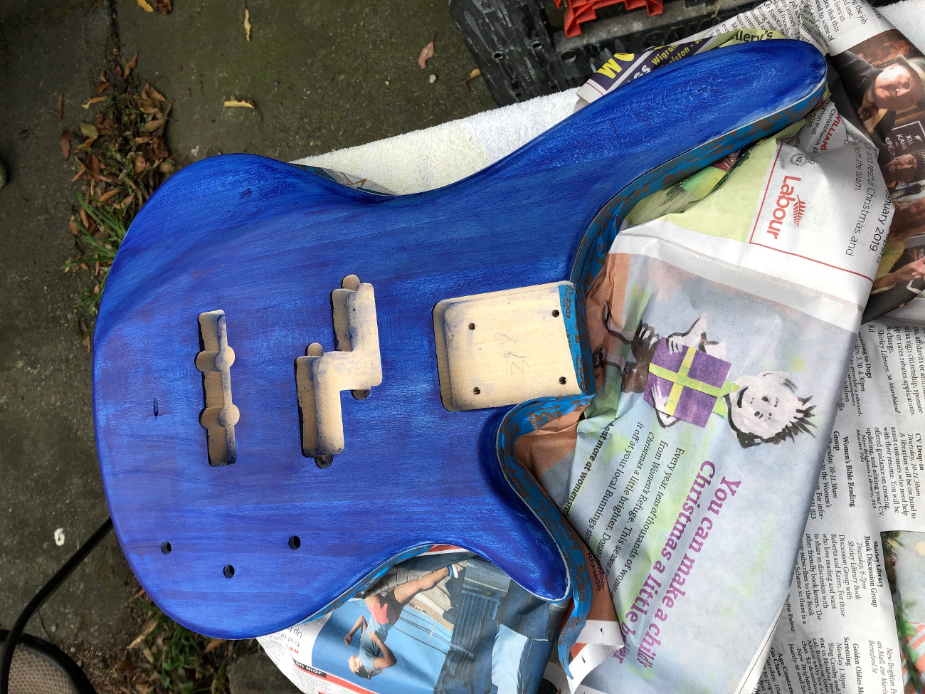 I used Resene Colourwood Apollo Blue - even a test pot was way too much stain, could probably stain about 20 guitars from it! Anyway - for any other kiwi's doing a build looking for a decent wood stain - they have a good range.