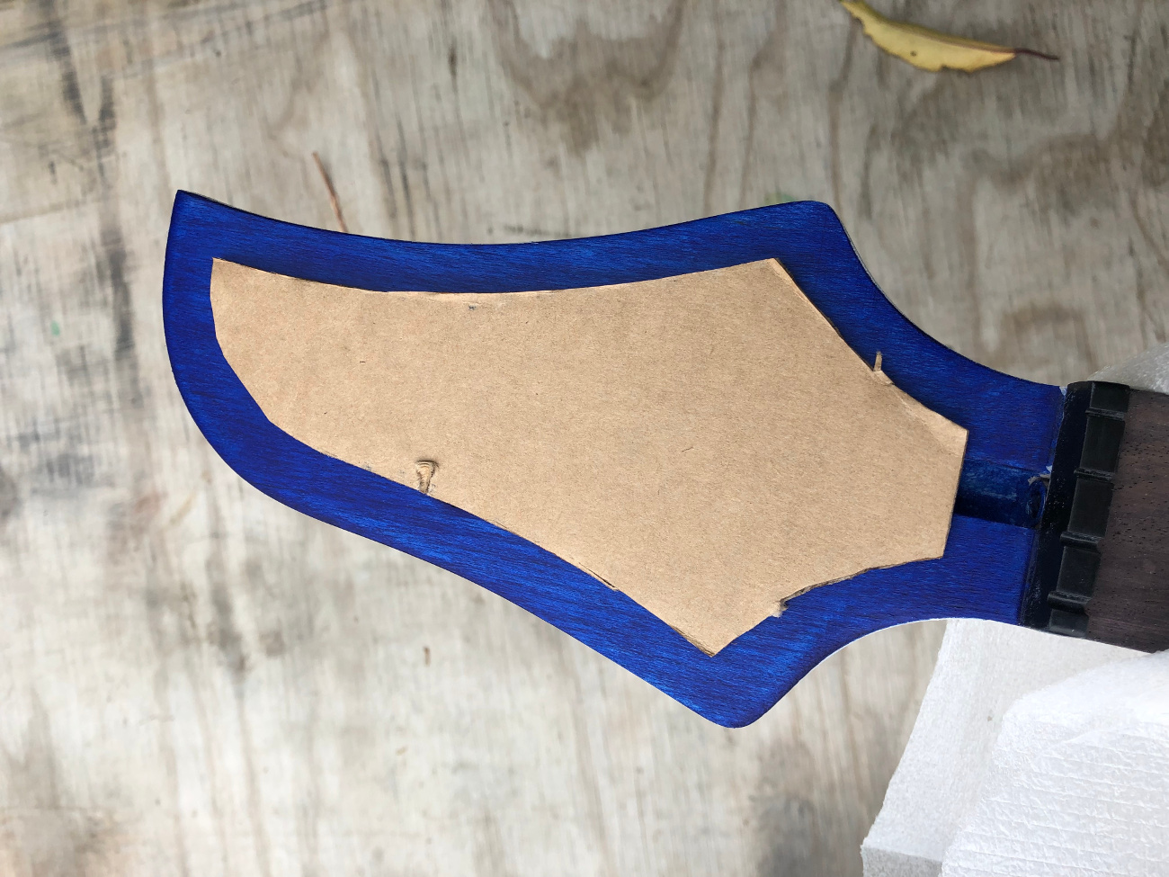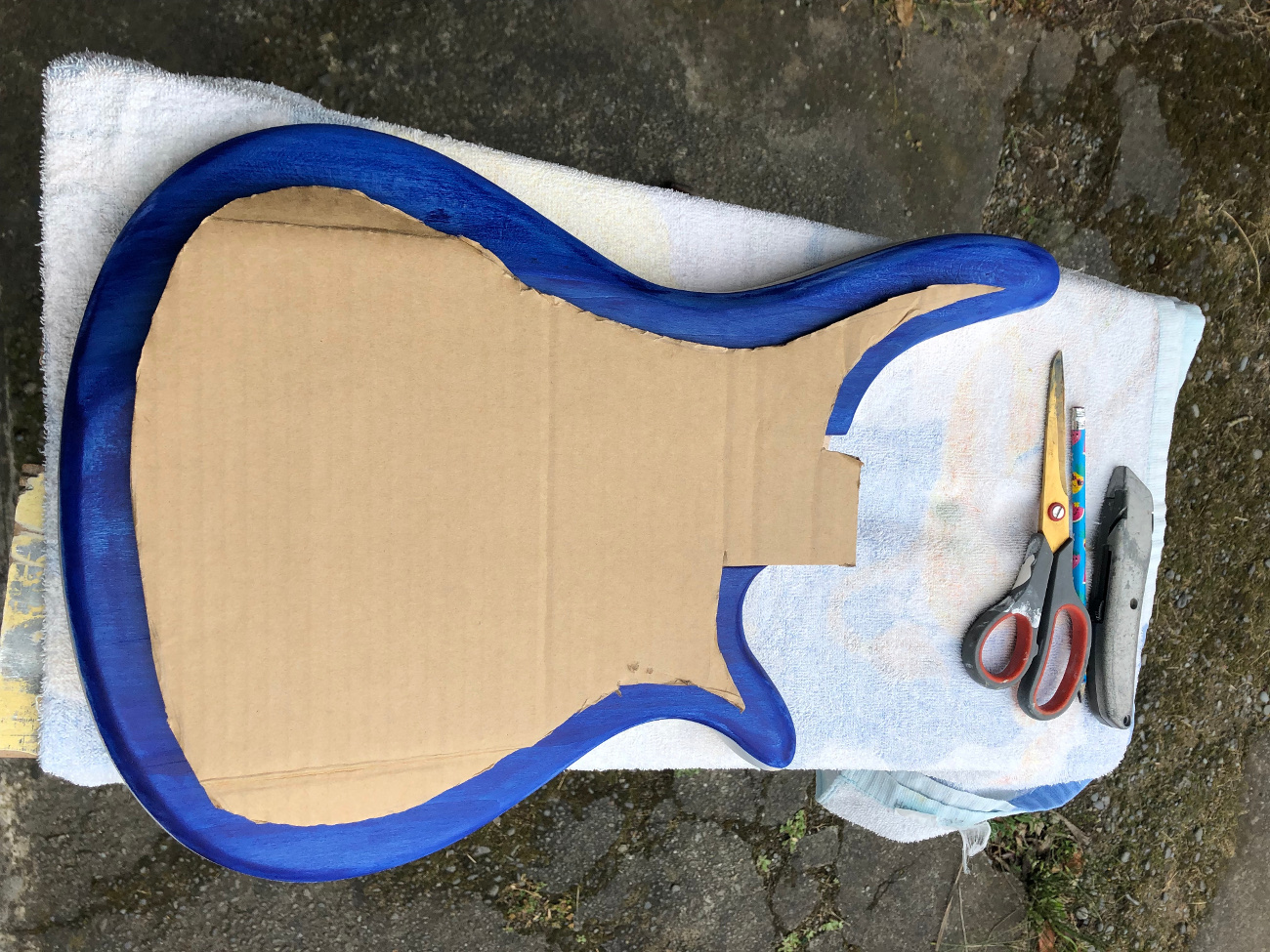 Next up, I cut out some cardboard shields to sit above the body and headstock, no secrets here - I'm going for a black sunburst effect. I saw this method on YouTube.