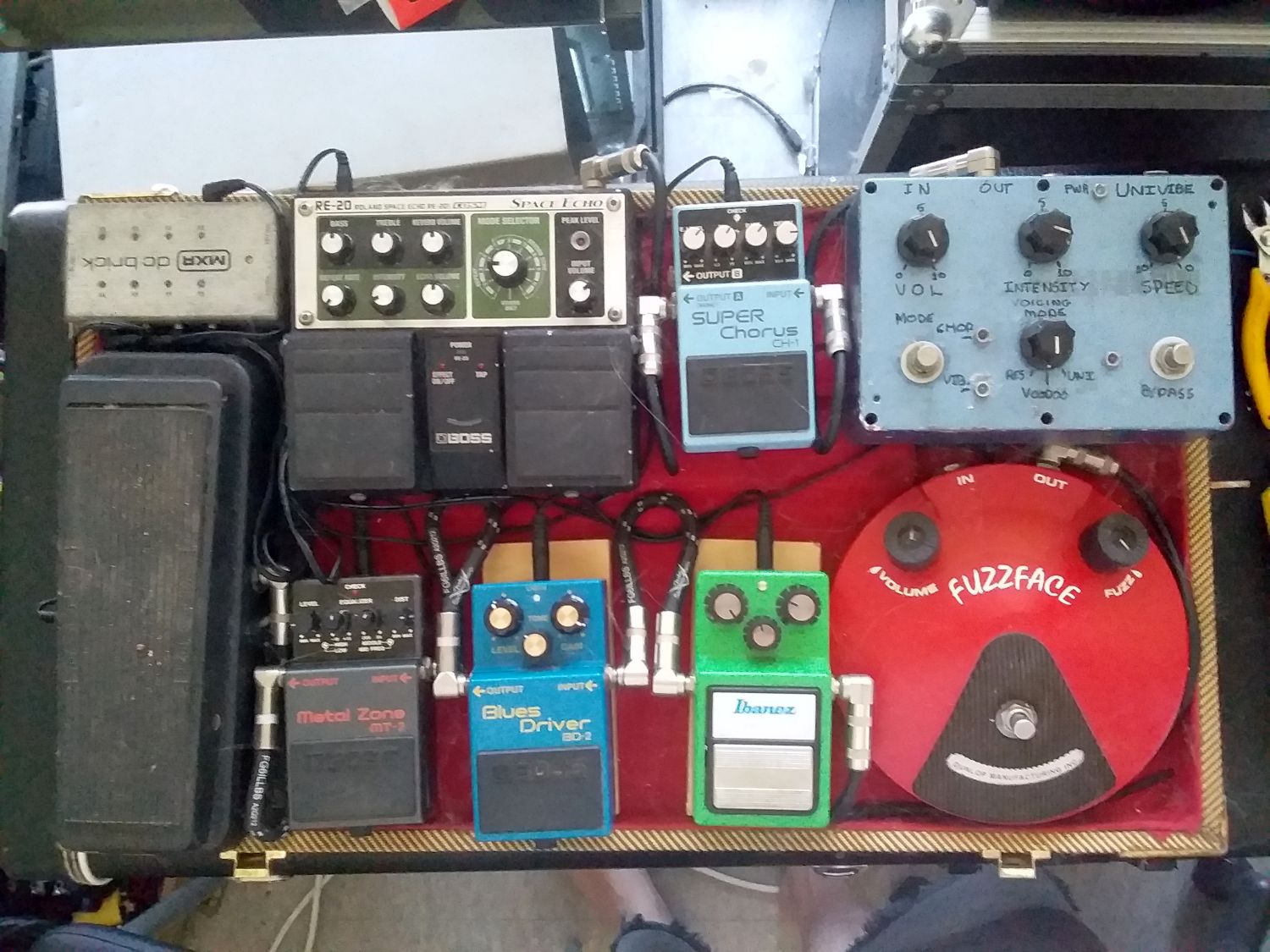 Then from the FX send it goes into the Univibe (big blue pedal in the upper-right corner), then into the Boss Super Chorus, then into the RE-20 Space Echo, and then into the amp's FX return.