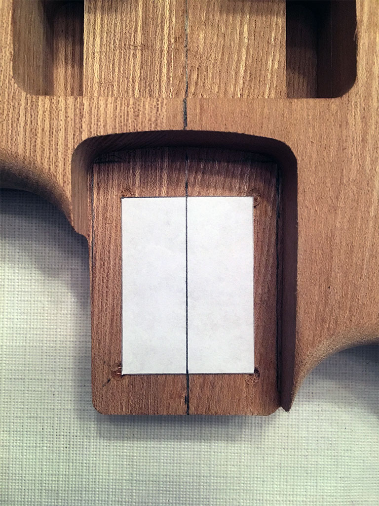 A 1.5" x 2" square piece of paper with a centerline drawn to hold up to the centerline in the pocket.