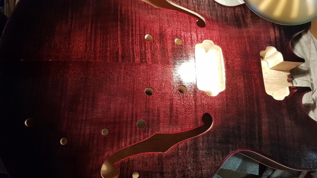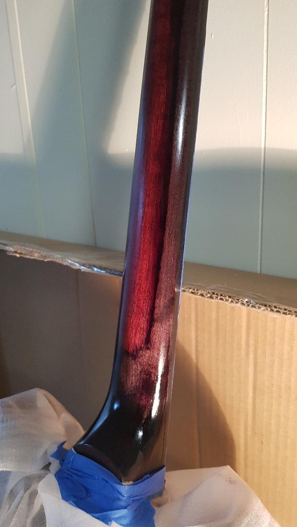 Up to here now. Got some blotches from what I expect is glue so decided to do a burst. Mahogany from black. Thing I noticed is that when I put the colour enhancer on and wiped it off it thinned the black, or the black thinned the mahogany, anyway it's a lot lighter in some places. Doesn't look bad. I just didn't know what to do with the finish to prep it for the colour enhancer and now I'm not sure what to do before the final shiny stuff except just wait.