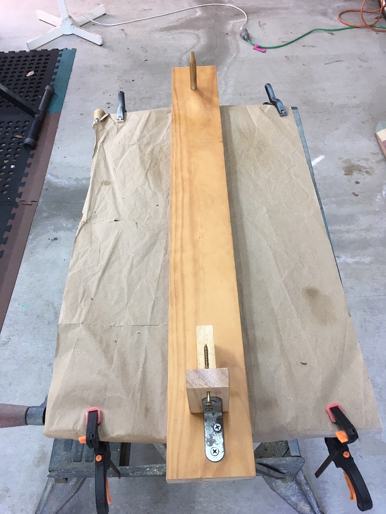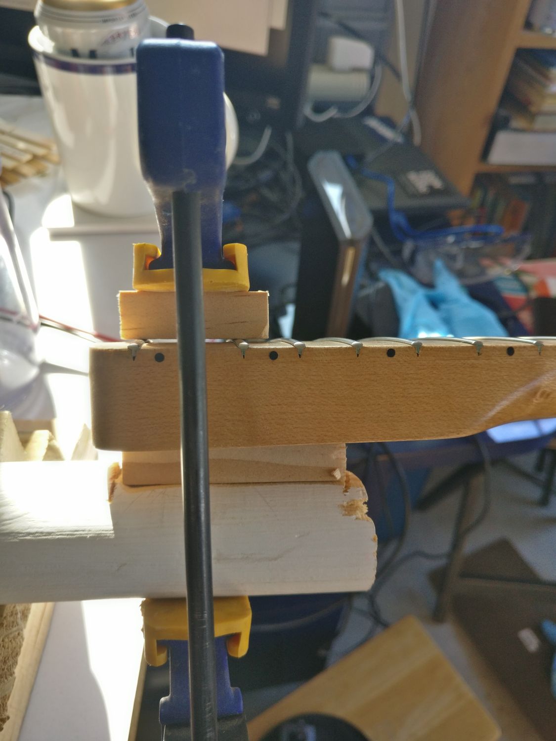 I am using a maple neck, so I will be finishing the fretboard, but it occurred to me that I don't care about the tops of the frets themselves. So I tried clamping a small block of wood (36x19x12 mm) on top of the frets. I screwed a similar but a little longer 56x19x12 block to a piece of old closet rod. I used a clamp to hold the whole thing together: