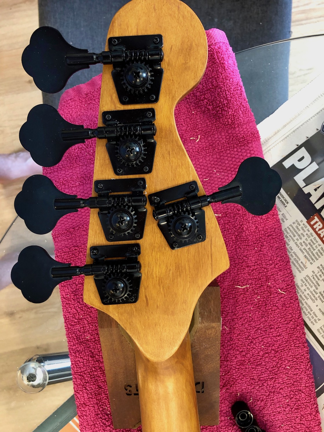 Attachment 32214 A bit more done. Neck , (replacement) Bridge and (some) tuners attached. Awaiting a replacement for a broken one. Fret markers done.