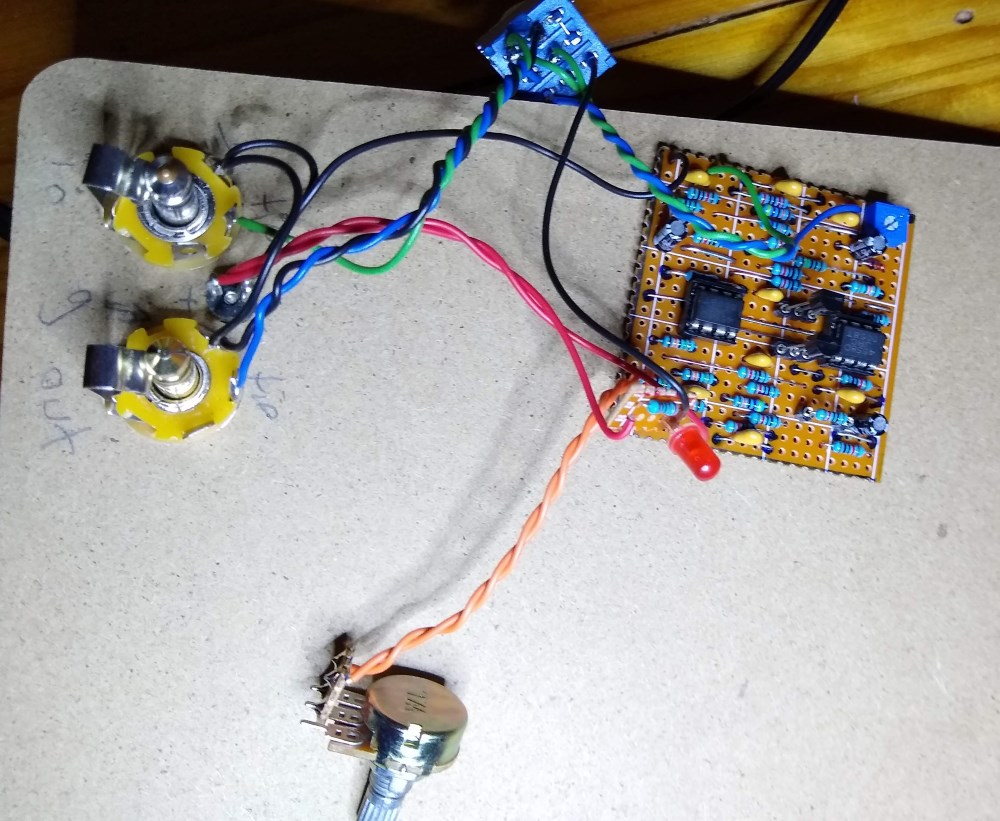 Compared to the diagram, I don't wire the LED directly to the footswitch. I make a tiny board from stripboard and solder the CLR, LED, and wires to that. It's a bit hard to see in the photo since it's over the main board. I like this approach since it lets me position the LED anywhere in the enclosure.