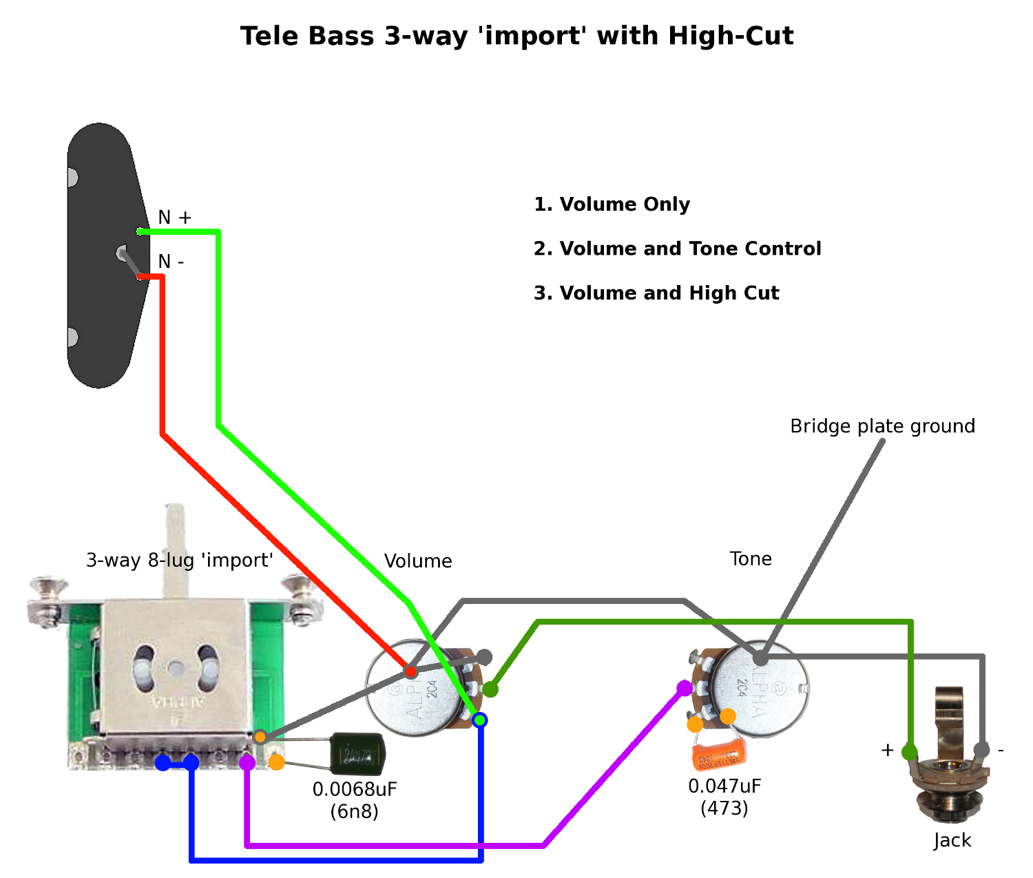 0068 cap, not our usual 0.068, 0.022 or 0.047 etc). Position 1 is just the volume control and nothing else. Position 2 gives volume and tone control. Position 3 is volume with the high cut, no tone.