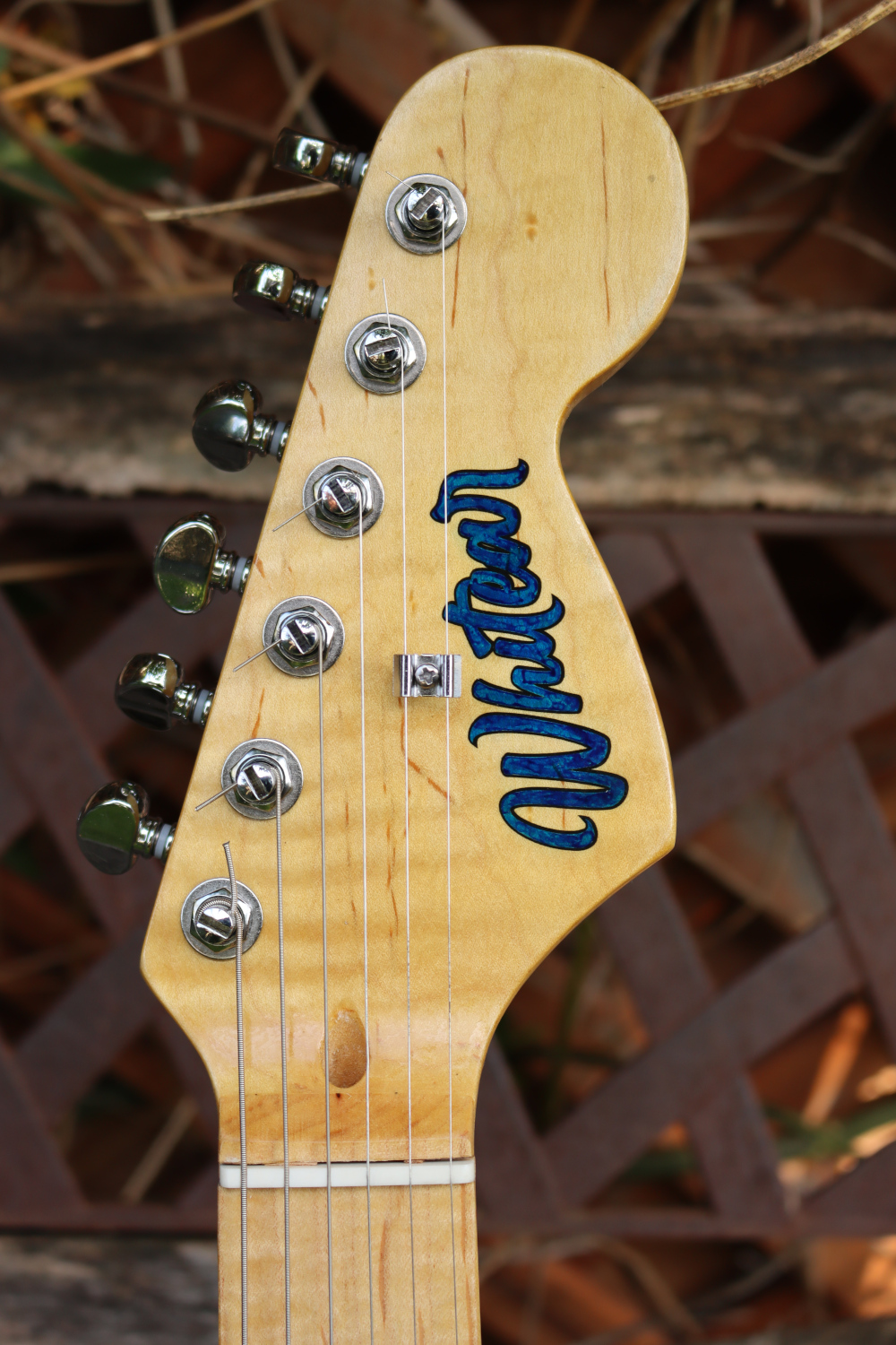 I had a bit of a nightmare with the headstock logo - the first attempt was all going well until I sanded through the Tru-oil and through the logo, so had to start again. The logo is a reverse printed waterslide decal, coloured in with blue ink. The bone nut is slightly narrower than the slot, so I've shimmed it with a couple of pieces of veneer for the time being.